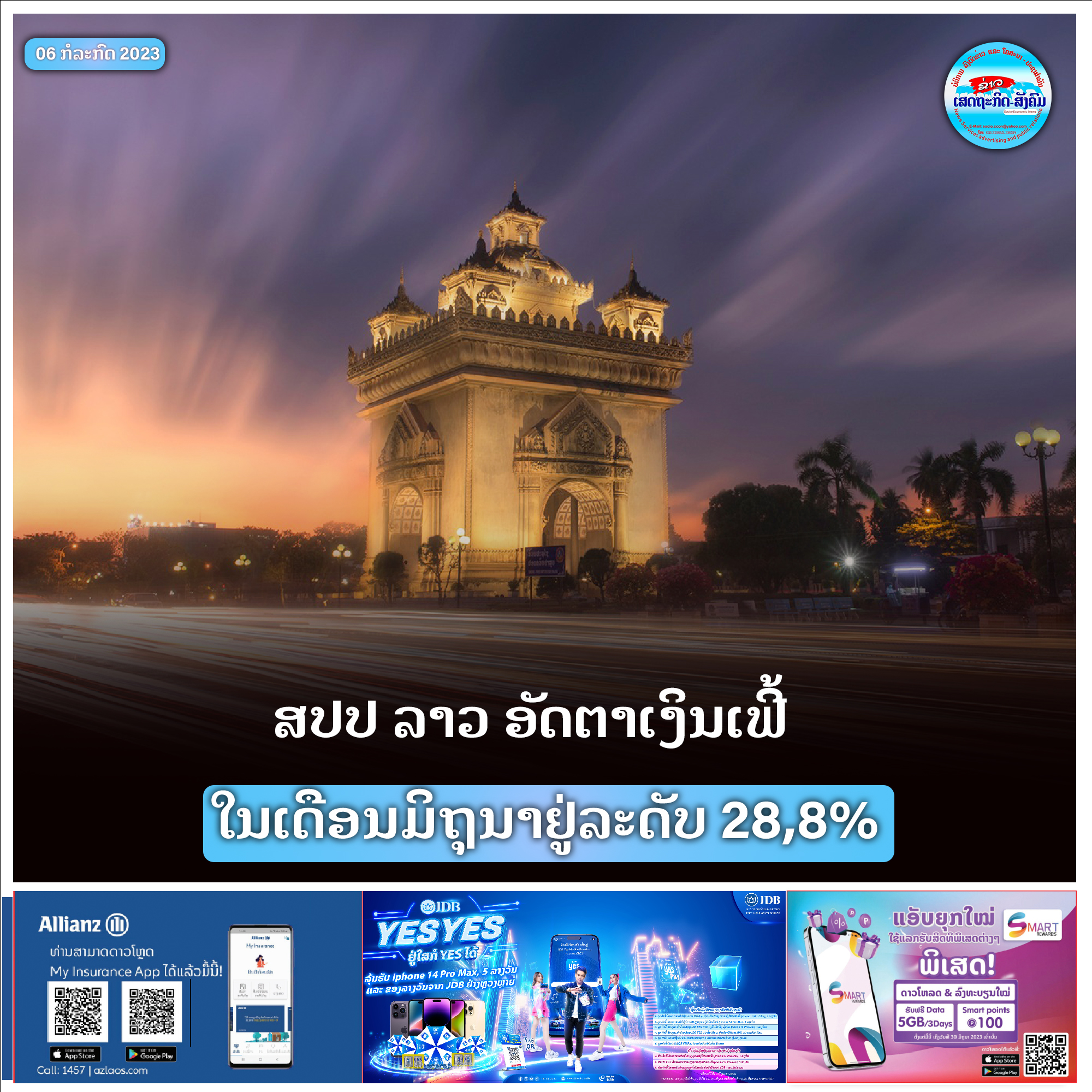 ດັດຊະນີລາຄາສິນຄ້າໂດຍລວມຂອງເດືອນມິຖຸນາ 2023 ຢູ່ໃນລະດັບ 185,91 ຊຶ່ງເພີ່ມຂຶ້ນຈາກ 144,52 ໃນເດືອນມິຖຸນາ ປີຜ່ານມາເຮັດໃຫ້ອັດຕາເງິນເຟີ້ລວມຂອງ ສປປ ລາວ ໃນເດືອນມິຖຸນາ 2023 ຢູ່ໃນລະດັບ 28,8% (ເດືອນພຶດສະພາ 2023 ຢູ່ໃນລະດັບ 38,9%).