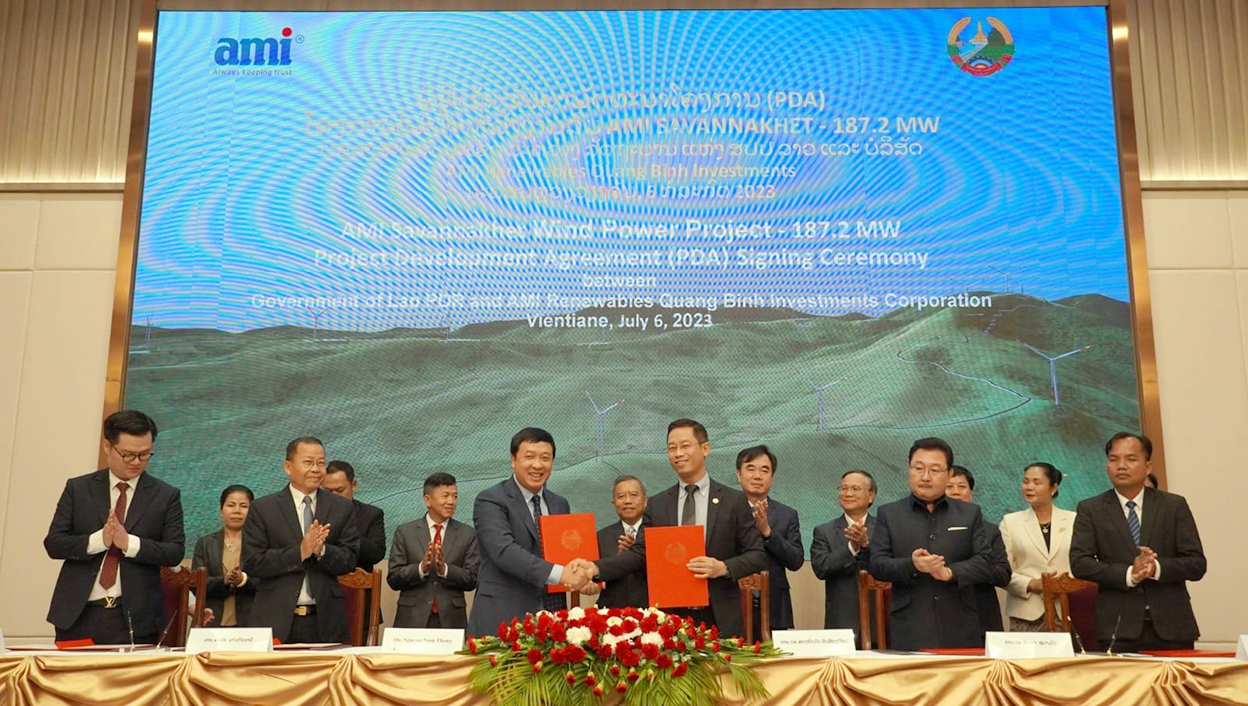 ສປປ ລາວ ບັນລຸຂໍ້ຕົກລົງ Project Development Agreement (PDA) ຊຶ່ງແມ່ນໂຄງການກໍ່ສ້າງໂຮງງານໄຟຟ້າດ້ວຍພະລັງງານລົມໃນເນື້ອທີ່ 2.687 ເຮັກຕາ, ຢູ່ເມືອງເຊໂປນ, ແຂວງສະຫວັນນະເຂດ ກັບ ບໍລິສັດຫຸ້ນສ່ວນການລົງທຶນ ເອເອັມໄອ ກວາງບິ່ງ (AMI).