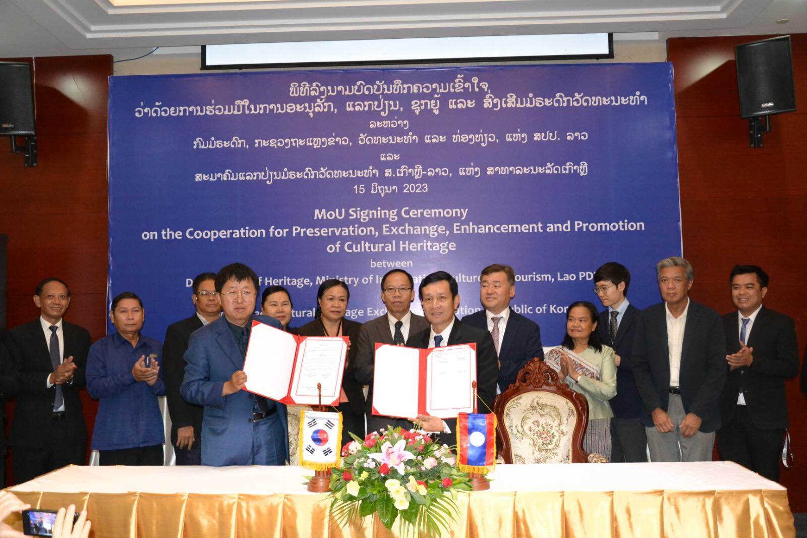 ກົມມໍລະດົກ ກະຊວງຖະແຫຼງຂ່າວ, ວັດທະນະທຳ ແລະ ທ່ອງທ່ຽວ (ຖວທ) ແລະສະມາຄົມແລກປ່ຽນມໍລະດົກວັດທະນະທຳ ສ ເກົາຫຼີ-ລາວ ແຫ່ງສາທາລະນະລັດເກົາຫຼີ ໄດ້ຈັດພິທີເຊັນສັນຍາຮ່ວມມືວ່າດ້ວຍການຮ່ວມມືໃນການອະນຸລັກ, ແລກປ່ຽນ, ຊຸກຍູ້ ແລະສົ່ງເສີມມໍລະດົກວັດທະນະທຳ
