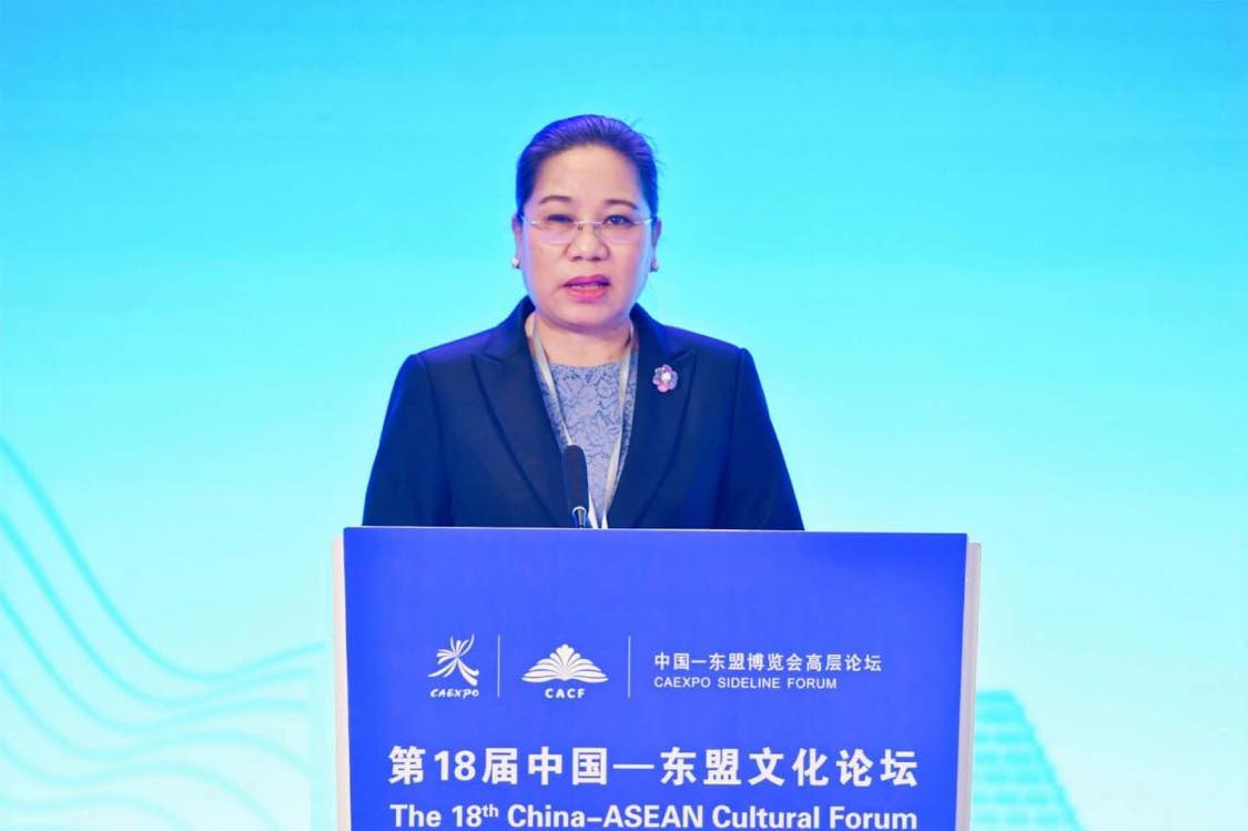ທ່ານ ນາງ ສວນສະຫວັນ ວິຍະເກດ ລັດຖະມົນຕີກະຊວງຖະແຫຼງຂ່າວ, ວັດທະນະທຳ ແລະທ່ອງທ່ຽວ ແຫ່ງ ສປປ ລາວ ມີຄໍາເຫັນຕໍ່ກອງປະຊຸມວັດທະນະທຳອາຊຽນ-ຈີນຄັ້ງທີ 18 ທີ່ຈັດຂຶ້ນຢູ່, ໜານໜິງ, ເຂດປົກຄອງກວາງຊີ, ສປ ຈີນ ໃນວັນທີ 19 ມິຖຸນາ 2023 ໂດຍທ່ານກ່າວວ່າ: