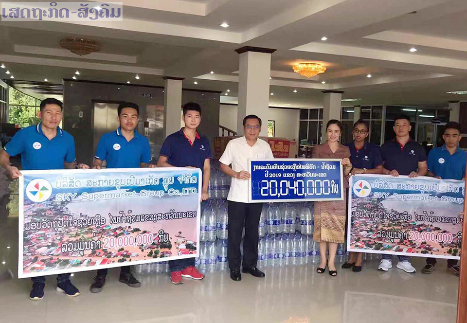 ວັນທີ 20 ກັນຍາ 2019 ທີ່ຫ້ອງວ່າການປົກຄອງແຂວງສະຫວັນນະເຂດ, ບໍລິສັດສະກາຍຊຸບເປີມາເກັດກຣຸບ ໄດ້ນຳເອົາເຂົ້າສານ, ເຄື່ອງອຸປະໂພກບໍລິໂພກ, ອາຫານແຫ້ງ, ໝີ່ ແລະເຄື່ອງນຸ່ງຮົ່ມເປັນວັດປັດຖຸໄຈຈຳນວນໜຶ່ງລວມມູນຄ່າ 20 ກວ່າລ້ານກີບ ມອບໃຫ້ຫ້ອງວ່າການປົກຄອງແຂວງສະຫວັນນະເຂດ