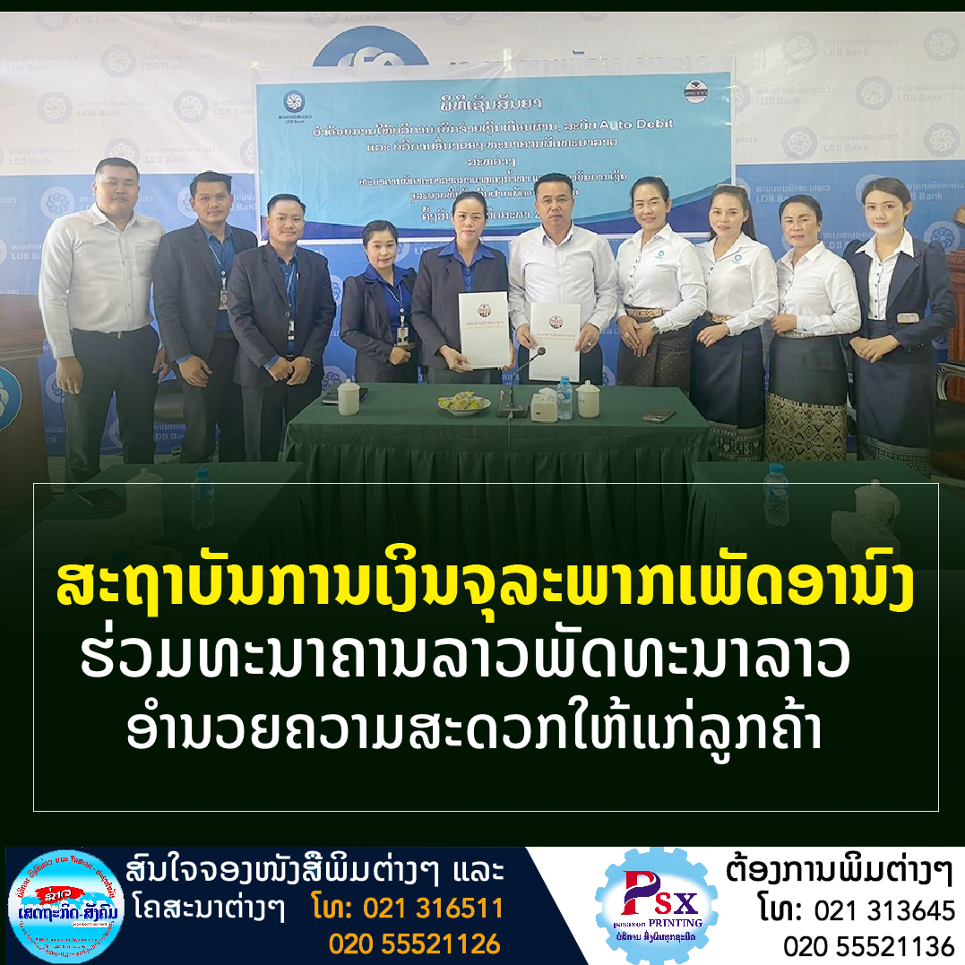ໃນວັນທີ 25 ພຶດສະພາ 20222 ຜ່ານມານີ້ສະຖານບັນການເງິນຈຸລະພາກທີ່ບໍ່ຮັບເງິນຝາກ ເພັດອານົງ ຈຳກັດ ໄດ້ຈັດພິທີເຊັນສັນຍາຮ່ວມກັບທະນາຄານພັດທະນາສາຂາຫຼວງນໍ້າທາ