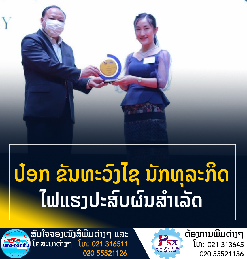 ທ່ານ ນາງ ປ໋ອກ ຂັນທະວົງໄຊ ນັກທຸລະກິດໄວລຸ້ນມາແຮງ ອາຍຸພຽງ 24 ປີ ທີ່ມີຫຼາກຫຼາຍຄວາມສາມາດກ້າເຮັດກ້າລົງທຶນ ແລະບວກຄວາມດຸໝັ່ນອົດທົນຮຽນຮູ້ສິ່ງໃໝ່ໆຈົນເຮັດໃຫ້ເປັນທີ່ຮູ້ຈັກຈາກສັງຄົມໂດຍສະເພາະວົງການນັກທຸລະກິດ ແລະຮັບລາງວັນນັກທຸລະກິດດີເດັ່ນປະຈຳປີ.