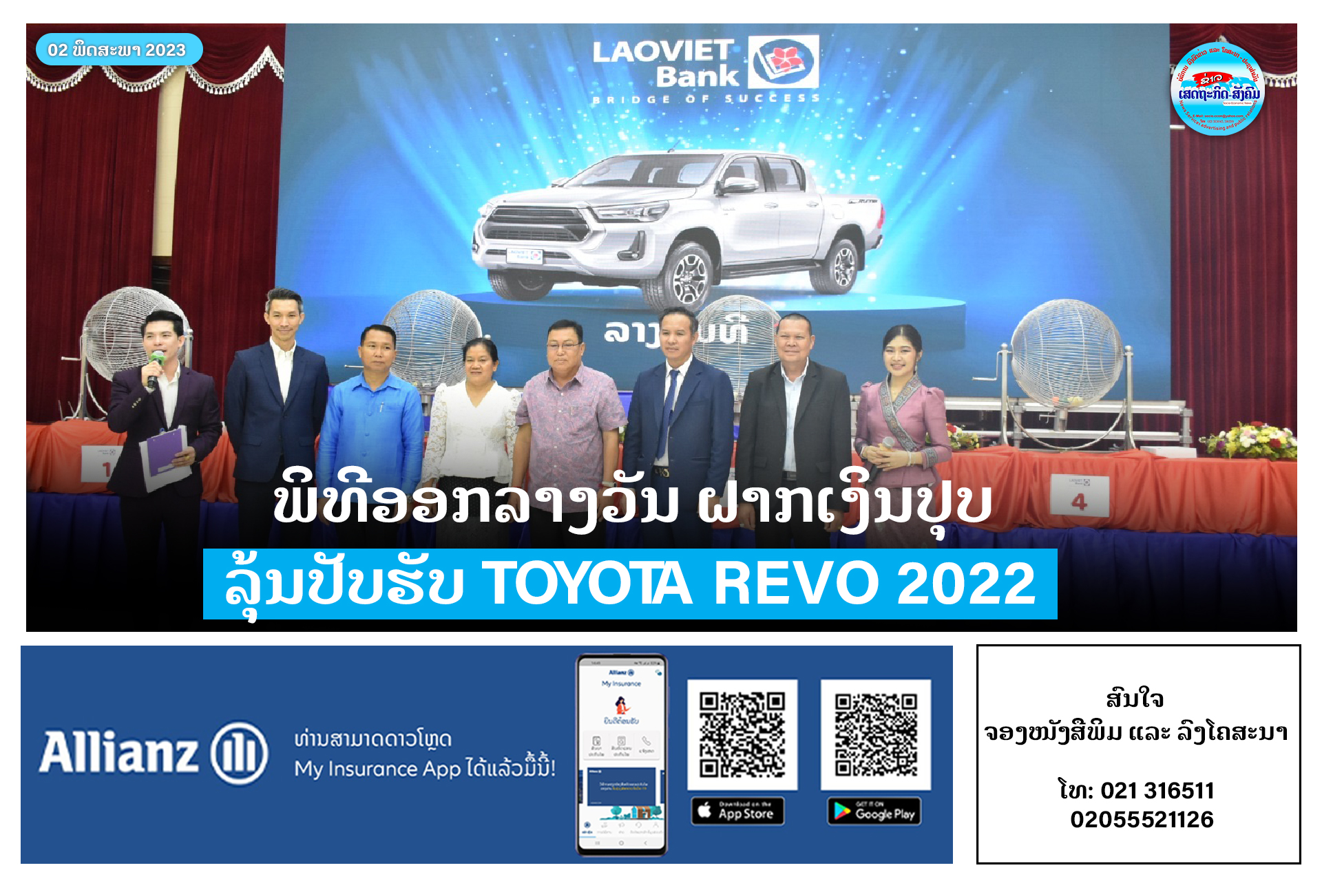 ໃນວັນທີ 27 ເມສາ 2023 ຢູ່ເຂດພັດທະນາຄົບວົງຈອນໜອງທາ ນະຄອນຫຼວງວຽງຈັນ ໄດ້ຈັດພິທີອອກລາງວັນ “ຝາກເງິນປຸບລຸ້ນປັບຮັບ TOYOTA REVO 2022”
