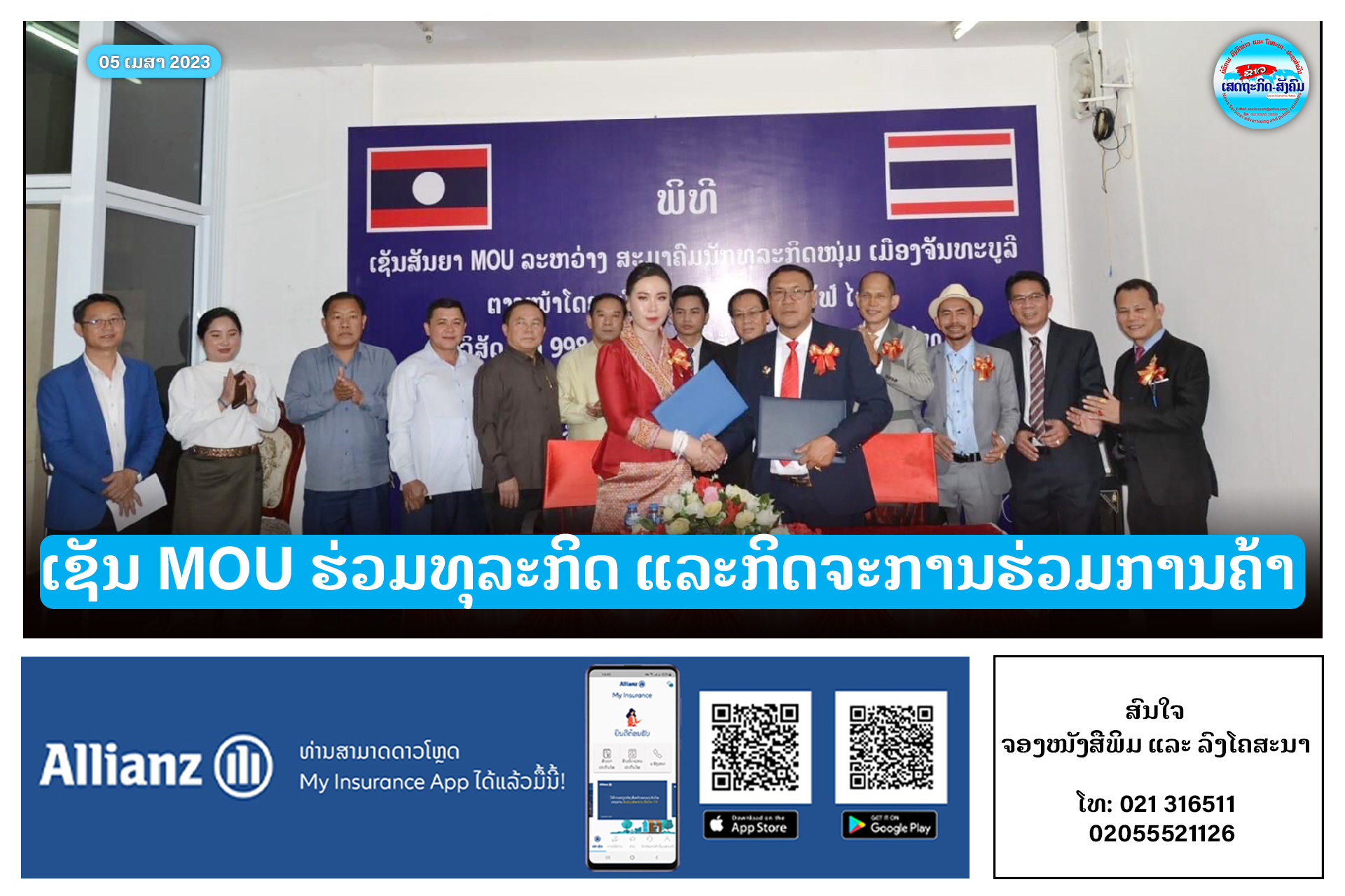 ພິທີເຊັນສັນຍາ MOU ລະຫວ່າງສະມາຄົມນັກທຸລະກິດໜຸ່ມ ເມືອງຈັນທະບູລີ ຕາງໜ້າໂດຍ ບໍລິສັດ ເດີພາວເວີອັອຟໄລຟ, ບໍລິສັດ ມີດີ 998 ລາວ ກັບ ບໍສິສັດ ມີດີ 998 ປະເທດໄທ ໄດ້ຈັດຂຶ້ນໃນວັນທີ 3 ເມສານີ້ທີ່ບ້ານໜອງທາເໜືອ ເມືອງຈັນທະບູລີ ນະຄອນຫຼວງວຽງຈັນ,