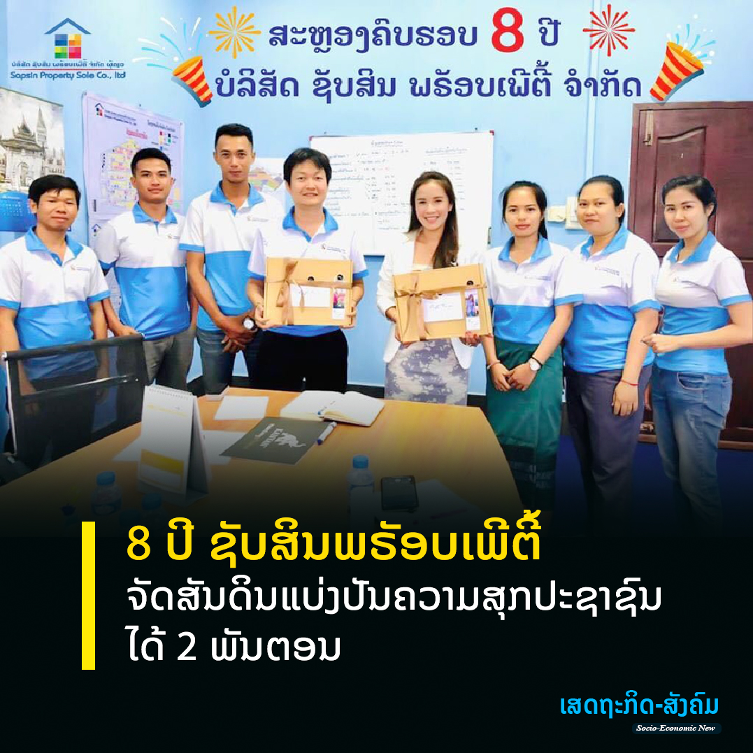 ບໍລິສັດ ຊັບສິນ ພຣັອບເພີຕີ້ ເປັນໜຶ່ງບໍລິສັດເອີ້ນວ່າຢູ່ໃນລະດັບແຖວໜ້າລາວທີ່ເພິ່ນມີຄວາມຮູ້ຄວາມສາມາດປະສົບການທີ່ສຳຄັນເພິ່ນສ້າງອຳນວຍຄວາມສະດວກຫຼາຍຢ່າງຈົນເຮັດໃຫ້ເປັນທີ່ຍອມຮັບຈາກສັງຄົມຕະຫຼອດ 8 ປີຜ່ານມາທີ່ຈັດສັນດິນໄດ້ 2 ພັນກວ່າຕອນ,