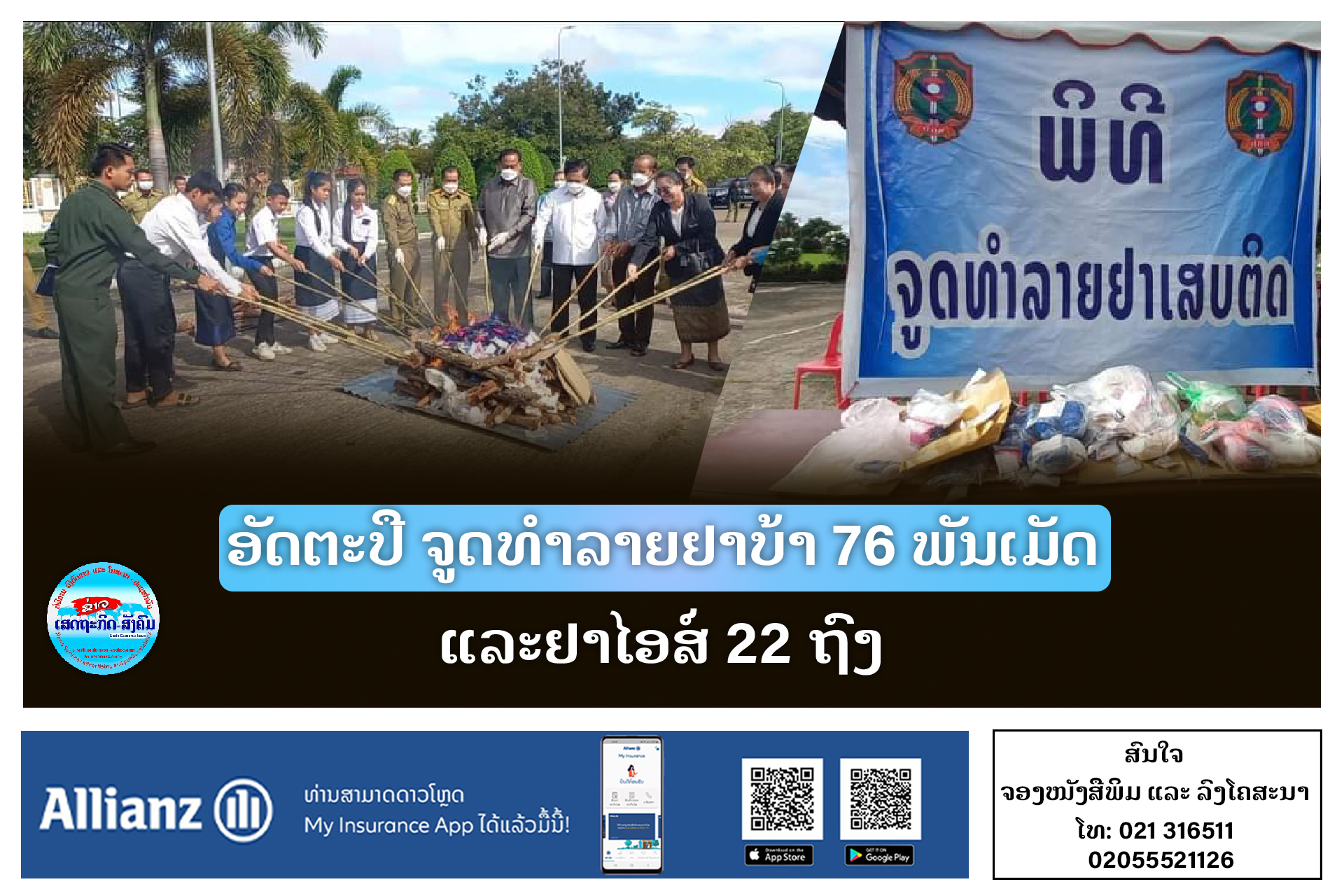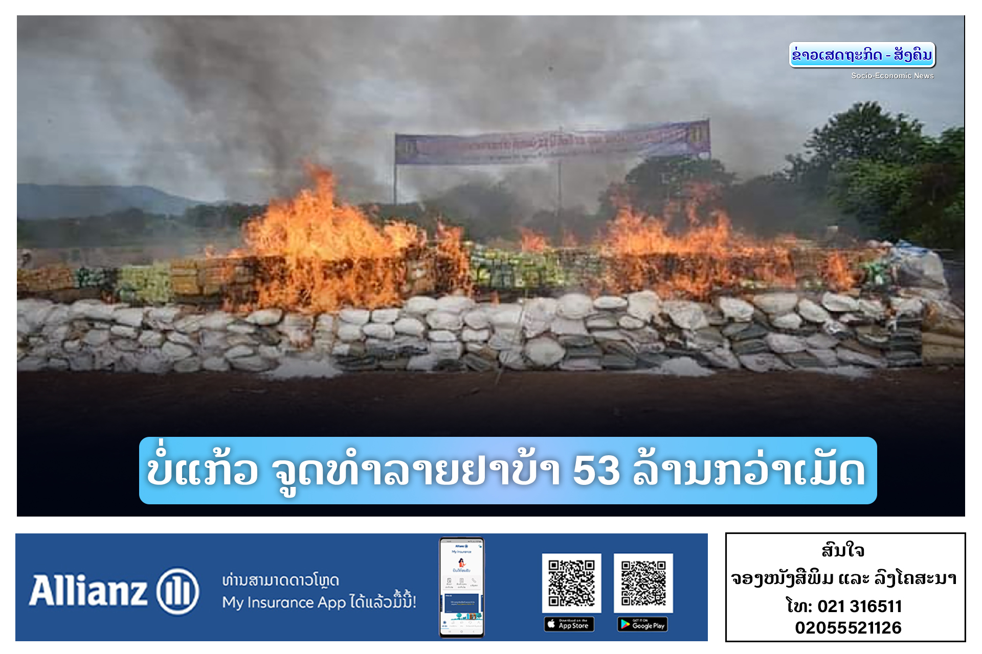 ແຂວງບໍ່ແກ້ວ ໄດ້ຈັດພິທີຈູກທໍາລາຍຢາເສບຕິດຫຼາຍລາຍການໃນນີ້, ຢາບ້າ 53.119.490 ເມັດ, ຢາບ້າມຸ່ນ 1 ຂວດ, ເຮໂລອິນ 3 ແທ່ງ, ຢາໄອສ໌ 3.281 ຫໍ່, ຢາອີ 217 ເມັດ, ເຄຕາມິນ 600 ຫໍ່, ຄາເຟອີນ 125 ຖົງນ້ອຍ, ໂຄເຄນ 03 ຖົງ,