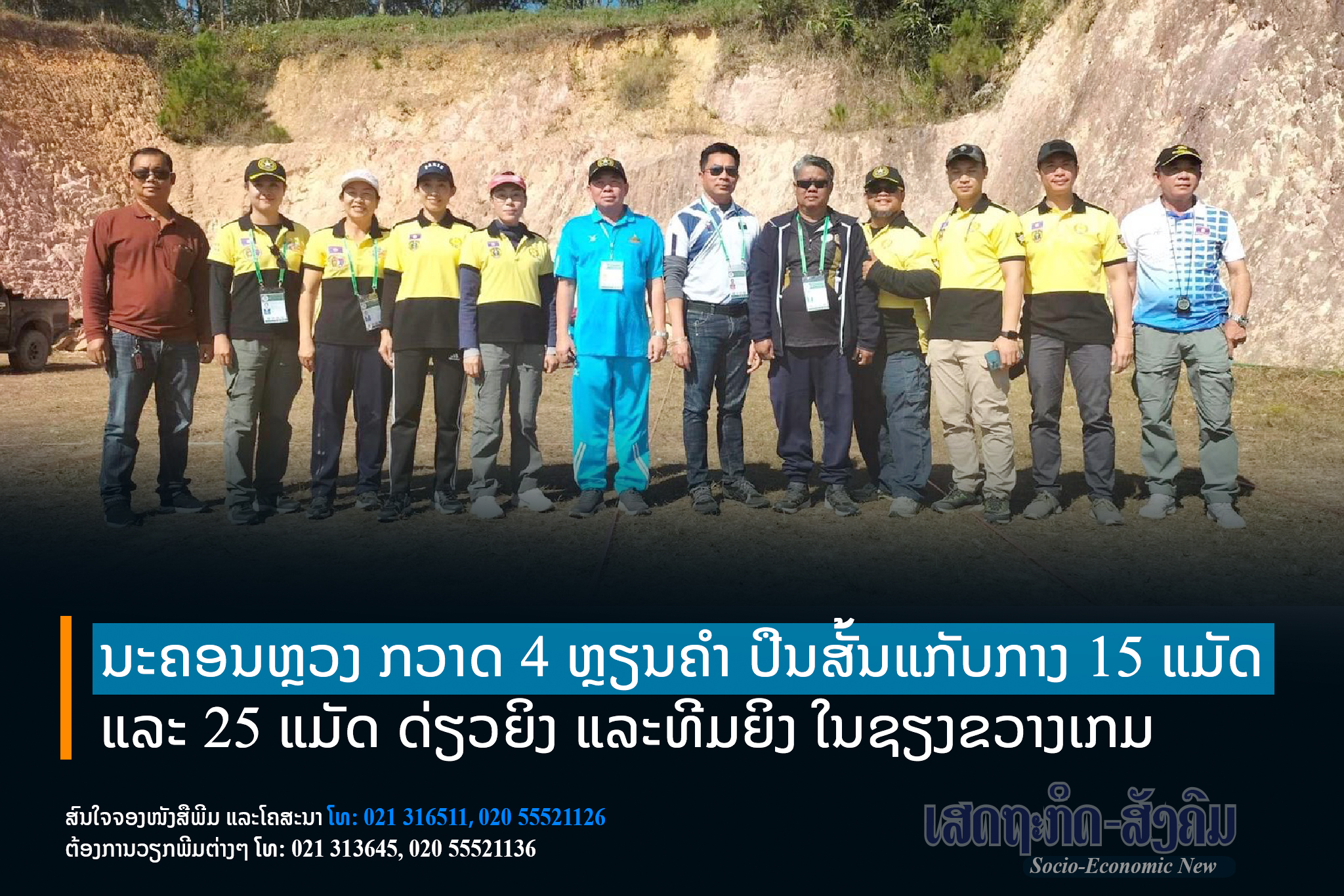 ທັບນັກກິລາຍິງປືນ ນະຄອນຫຼວງວຽງຈັນ ກວາດ 4 ຫຼຽນຄຳ ປິດສາກການແຂ່ງຂັນປືນສັ້ນແກັບກາງ ໄລຍະ 15 ແມັດ ແລະ 25 ແມັດ ດ່ຽວຍິງ-ທີມຍິງ ໃນງານມະຫະກຳກິລາແຫ່ງຊາດ ຄັ້ງທີ 11 ຫຼື ຊຽງຂວາງເກມ ທີ່ແຂວງຊຽງຂວາງ ຮັບກຽດເປັນເຈົ້າພາບ.