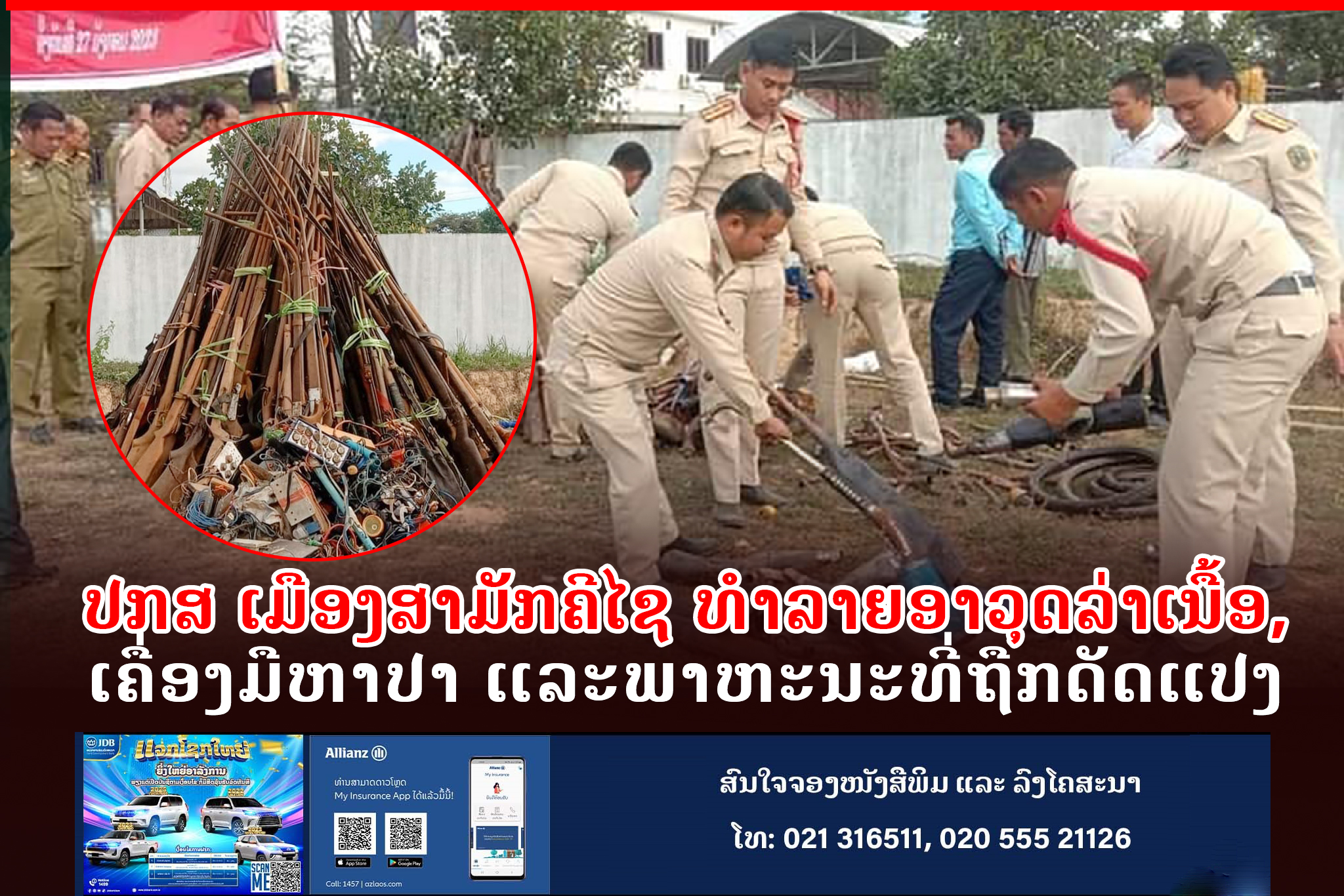 ໃນວັນທີ 27 ມັງກອນ 2023 ປກສ ເມືອງສາມັກຄີໄຊ ແຂວງອັດຕະປື ໄດ້ຈັດພິທີທໍາລາຍອາວຸດລ່າເນື້ອ, ເຄື່ອງມືຫາປາ ແລະ ພາຫະນະທີ່ຖືກດັດແປງແບບຜິດກົດໝາຍຂື້ນຢູ່ທີ່ກອງບັນຊາການດັ່ງກ່າວ,