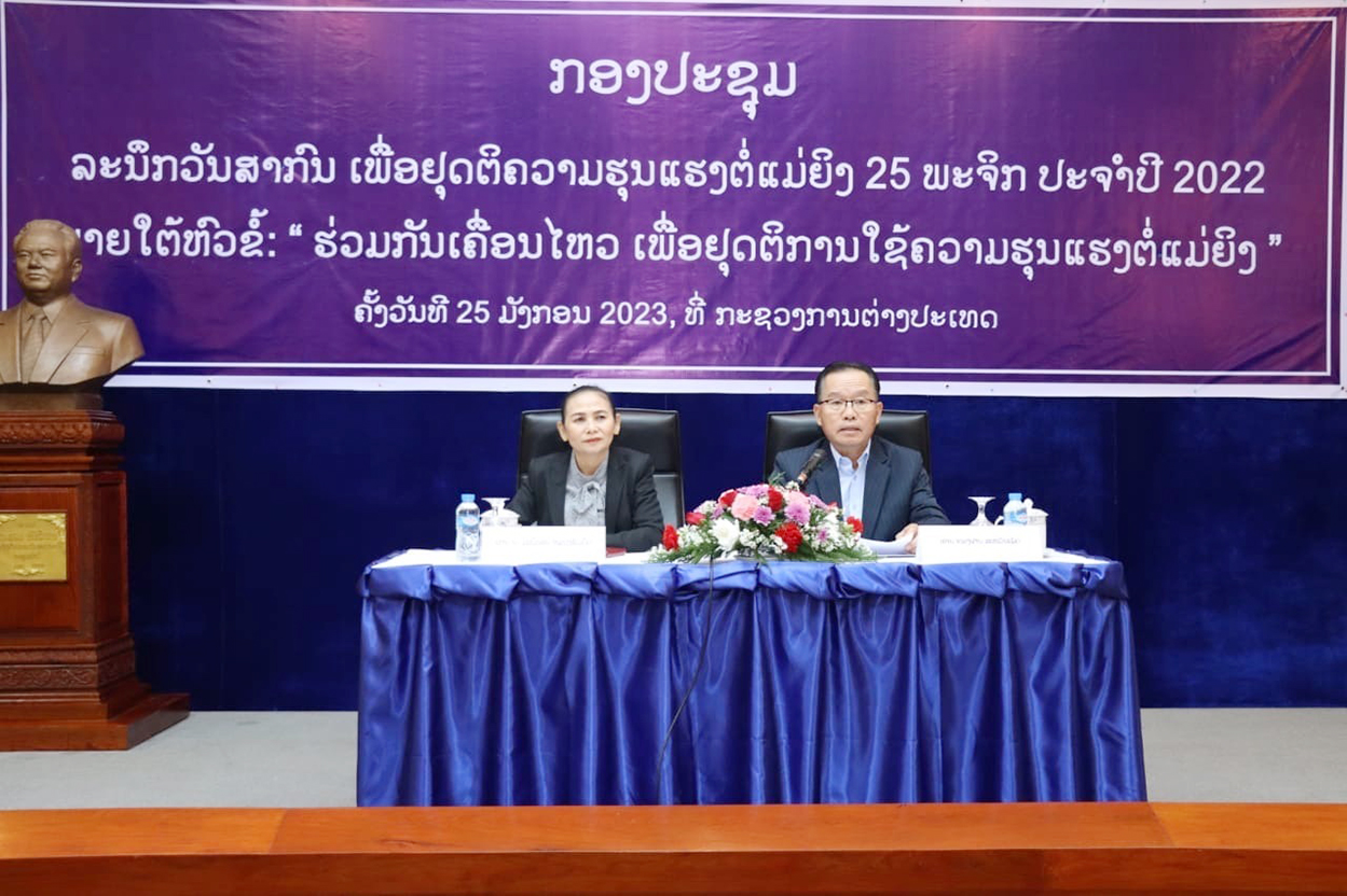 ຄະນະກຳມາທິການ ເພື່ອຄວາມກ້າວໜ້າຂອງແມ່ຍິງ ແລະແມ່-ເດັກ ກະຊວງການຕ່າງປະເທດໄດ້ຈັດກອງປະຊຸມເຜີຍແຜ່ບາງເອກະສານສຳຄັນເພື່ອລະນຶກວັນສາກົນ ເພື່ອຢຸດຕິຄວາມຮຸນແຮງຕໍ່ແມ່ຍິງ ວັນທີ 25 ພະຈິກ ຊຶ່ງຈັດຂຶ້ນ ໃນວັນທີ 25 ມັງກອນ 2023 ທີ່ນະຄອນຫຼວງວຽງຈັນ,