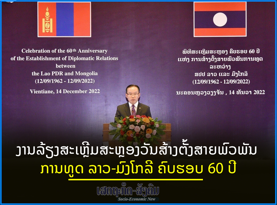 ໃນຕອນຄໍ່າວັນທີ 14 ທັນວາ 2022, ທີ່ໂຮງແຮມແລນມາກ, ນະຄອນຫຼວງວຽງຈັນ, ກະຊວງການຕ່າງປະເທດແຫ່ງຮ່ວມກັບສະຖານເອກອັກຄະລັດຖະທູດ ແຫ່ງ ມົງໂກລີ ປະຈໍາ ສປປ ລາວ ໄດ້ຈັດງານລ້ຽງສະເຫຼີມສະຫຼອງວັນສ້າງຕັ້ງສາຍພົວພັນການທູດລະຫວ່າງ ລາວ-ມົງໂກລີ ຄົບຮອບ 60 ປີ,