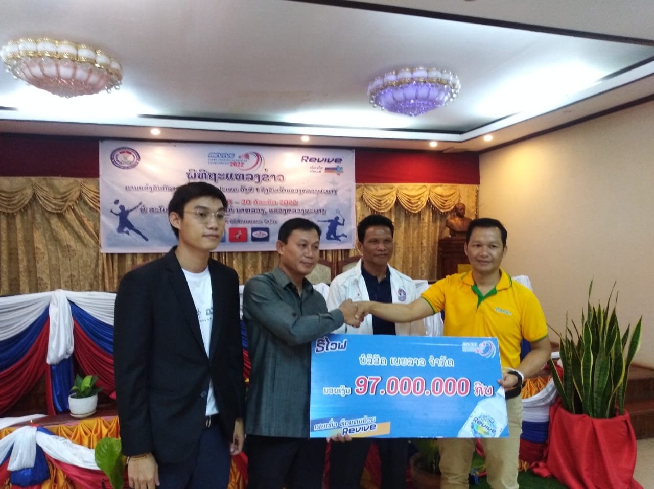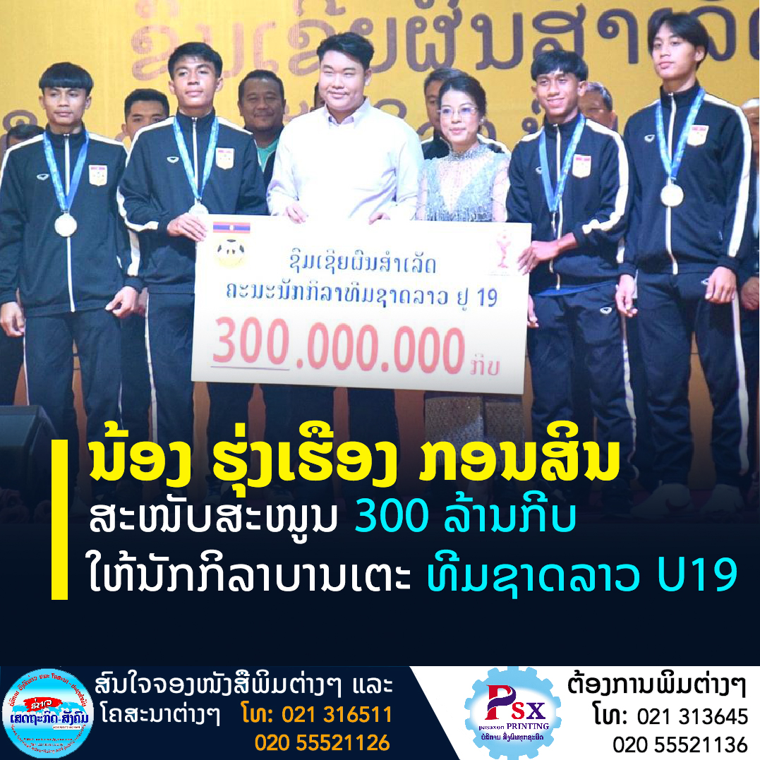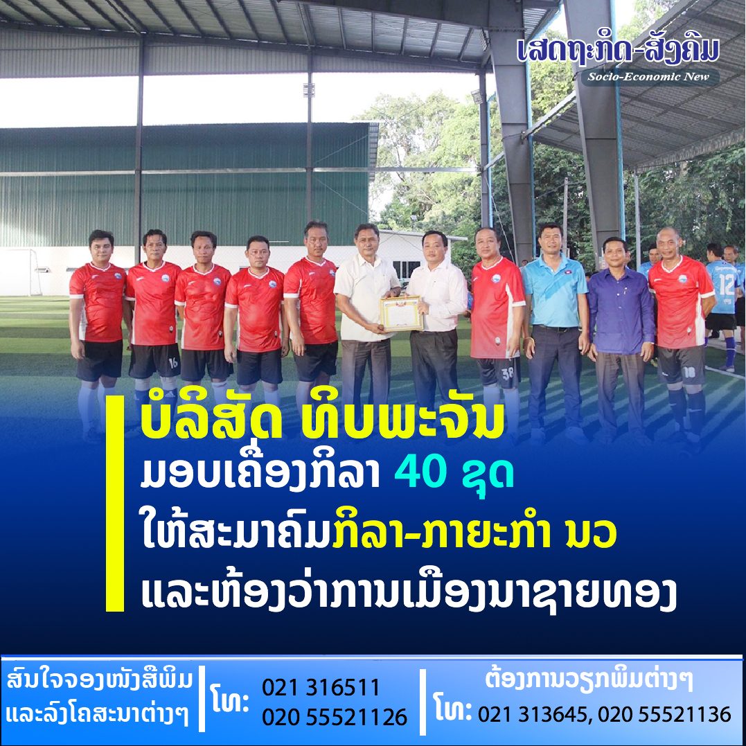 ບໍລິສັດ ທິບພະຈັນ ຈໍາກັດ ກໍຄືສູນກິລາ ທີພີຊີ ຄົບວົງຈອນ ມອບເຄື່ອງກິລາ ຈຳນວນ 40 ຊຸດ ລວມມູນຄ່າ 5,3 ລ້ານກີບ ໃຫ້ກັບສະມາຄົມກິລາ-ກາຍະກຳ