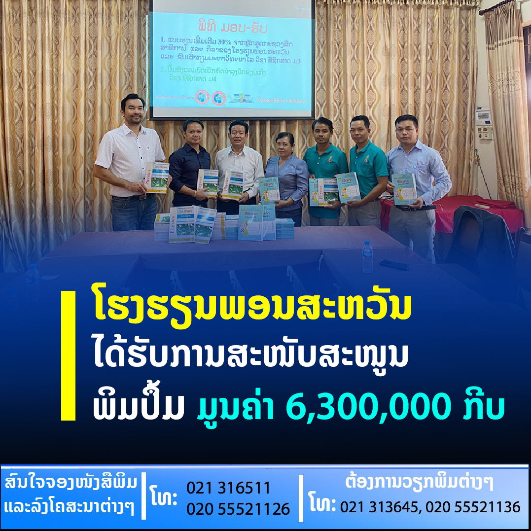 ຕອນບ່າຍວັນທີ 18 ສິງຫາ 2022 ຢູ່ທີ່ຫ້ອງປະຊຸມໂຮງຮຽນພອນສະຫວັນ ແລະຊົນເຜົ່າກຽມມະຫາວິທະຍາໄລ(ຮພຊ) ໄດ້ມີພິທີມອບ-ຮັບປຶ້ມແບບຮຽນວິຊາຟີຊິກສາດ ລວມມູນຄ່າທັງໝົດ 6,300,000 ກີບ;