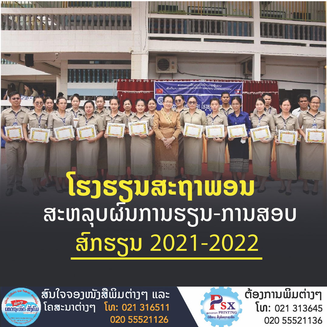 ໂຮງຮຽນອານຸບານ-ປະຖົມ-ມັດທະຍົມຕົ້ນ ສະຖາພອນ ຈັດພິທີສະຫລຸບປີຮຽນປະຈຳສົກຮຽນ 2021-2022 ໃນວັນທີ 24 ມິຖຸນາ 2022 ເພື່ອສະຫລຸບຕີລາຄາຜົນການຈັດຕັ້ງປະຕິບັດການຮຽນ-ການສອນ ໃນສົກປີຜ່ານມາ, ພ້ອມທັງເປັນການມອບໃບ ຍ້ອງຍໍຜົນງານໃຫ້ແກ່ພະນັກງານຄູ-ອາຈານ ແລະ ນັກຮຽນເກັ່ງ,