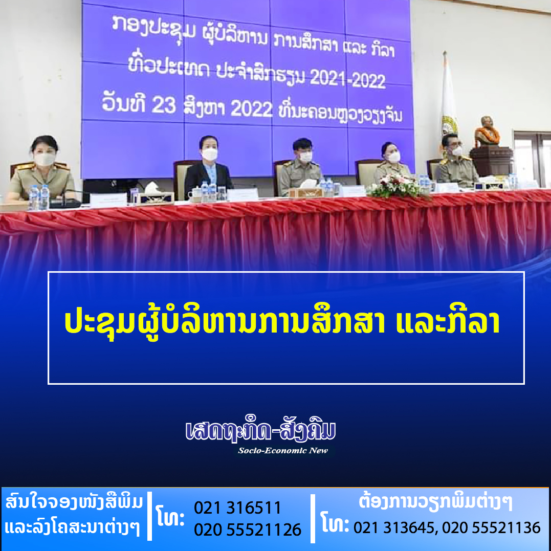 ກອງປະຊຸມຜູ້ບໍລິຫານການສຶກສາ ແລະກີລາ ປະຈໍາສົກຮຽນ 2022-2023 ໄດ້ຈັດຂຶ້ນໃນວັນທີ 23 ສິງຫາ ນີ້ ທີ່ຫ້ອງປະຊຸມສູນໄອຊີທີ ນະຄອນຫຼວງວຽງຈັນ ໂດຍການເປັນປະທານຂອງທ່ານ ພຸດ ສິມມາລາວົງ ລັດຖະມົນຕີກະຊວງສຶກສາທິການ ແລະ ກິລາ,