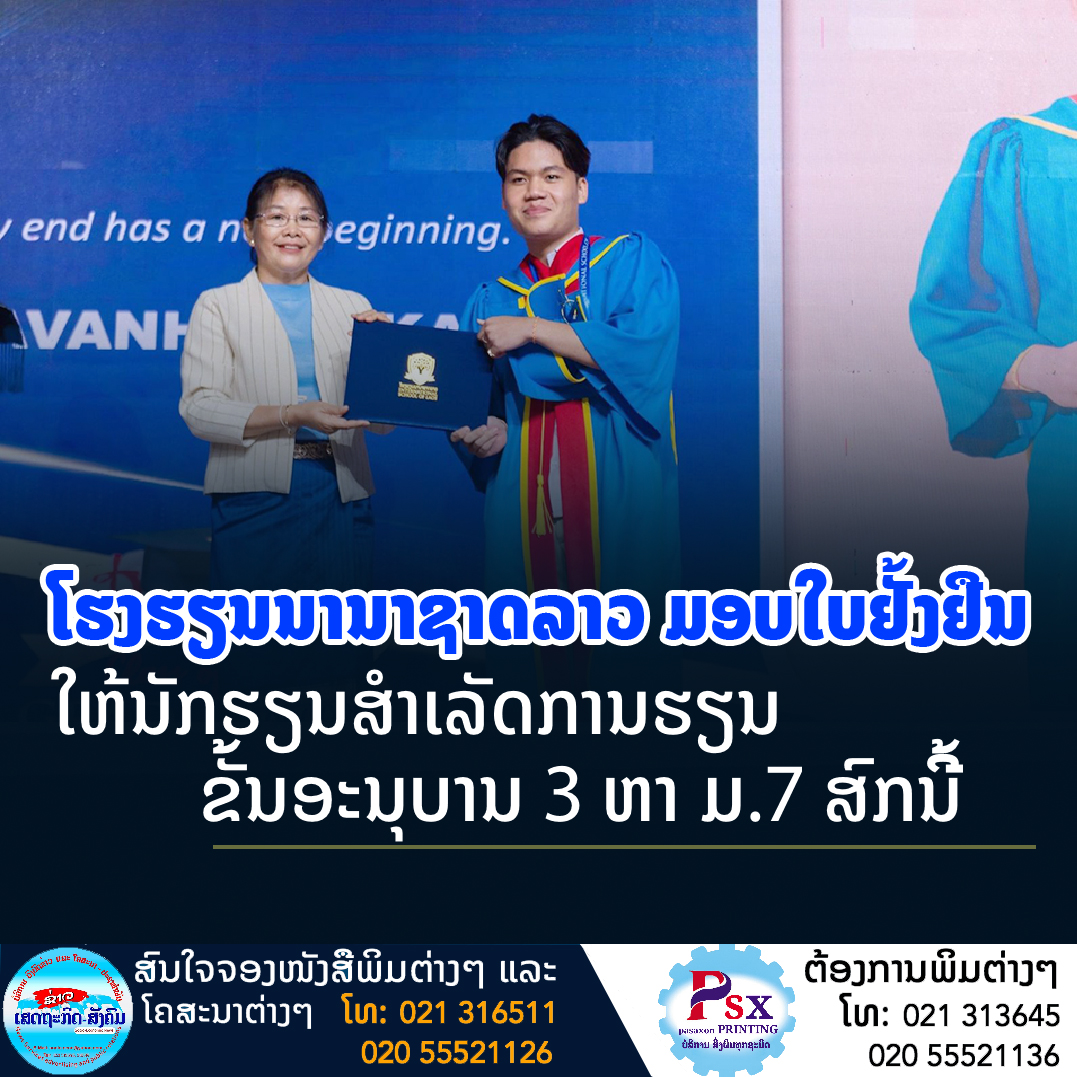 ໂຮງຮຽນ (ຮຮ) ນານາຊາລາວ ໄດ້ຈັດພິທີມອບໃບຢັ້ງຢືນໃຫ້ນັກຮຽນແຕ່ຊັ້ນອະນຸບານ 3 ຫາຊັ້ນມັດທະຍົມສຶກສາຕອນປາຍ (ມ.7) ສົກຮຽນ 2021-2022 ໃນວັນທີ 28 ພຶດສະພາ 2022 ທີ່ໂຮງແຮມແລນມາກ ນະຄອນຫຼວງວຽງຈັນ,