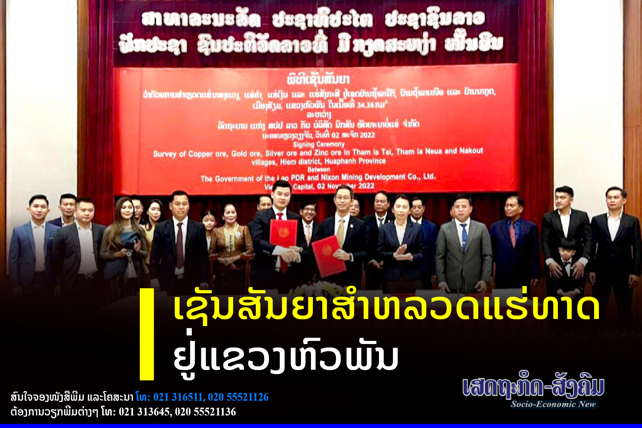 ວັນທີ 2 ພະຈິກ 2022 ຢູ່ທີ່ຫ້ອງປະຊຸມຂອງກະຊວງແຜນການ ແລະການລົງທືນໄດ້ມີພິທີເຊັນສັນຍາສຳຫລວດ ແຮ່ທອງແດງ ແຮ່ຄຳ ແຮ່ເງີນ ແຮ່ເຫຼັກ ແລະແຮ່ສັ່ງກະສີ ແຂວງຫົວພັນໃນເນື້ອທີ່ 34,36 ກມ 2 ລະຫວ່າງ ລັດຖະບານແຫ່ງ ສປປລາວ