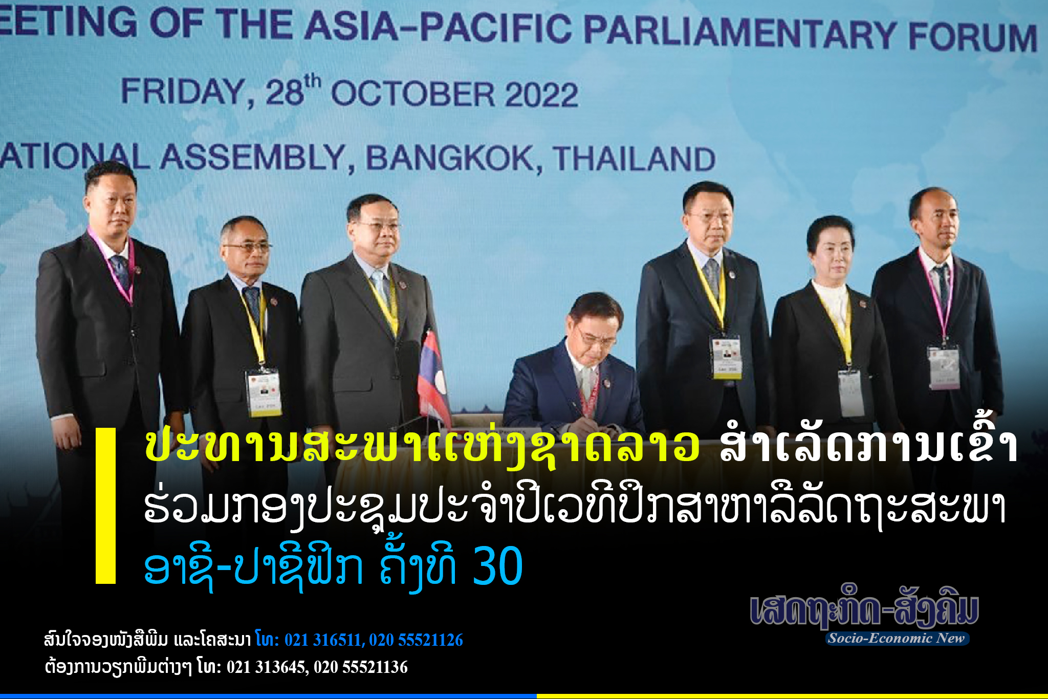 ຄະນະຜູ້ແທນຂັ້ນສູງຂອງສະພາແຫ່ງຊາດລາວນໍາໂດຍ ທ່ານ ໄຊສົມພອນ ພົມວິຫານ ປະທານສະພາແຫ່ງຊາດ ແຫ່ງ ສປປ ລາວ ໄດ້ສຳເລັດການເຂົ້າຮ່ວມກອງປະຊຸມປະຈຳປີ ເວທີປຶກສາຫາລືລັດຖະສະພາອາຊີ-ປາຊີຟິກ (APPF) ຄັ້ງທີ 30 ທີ່ບາງກອກ,