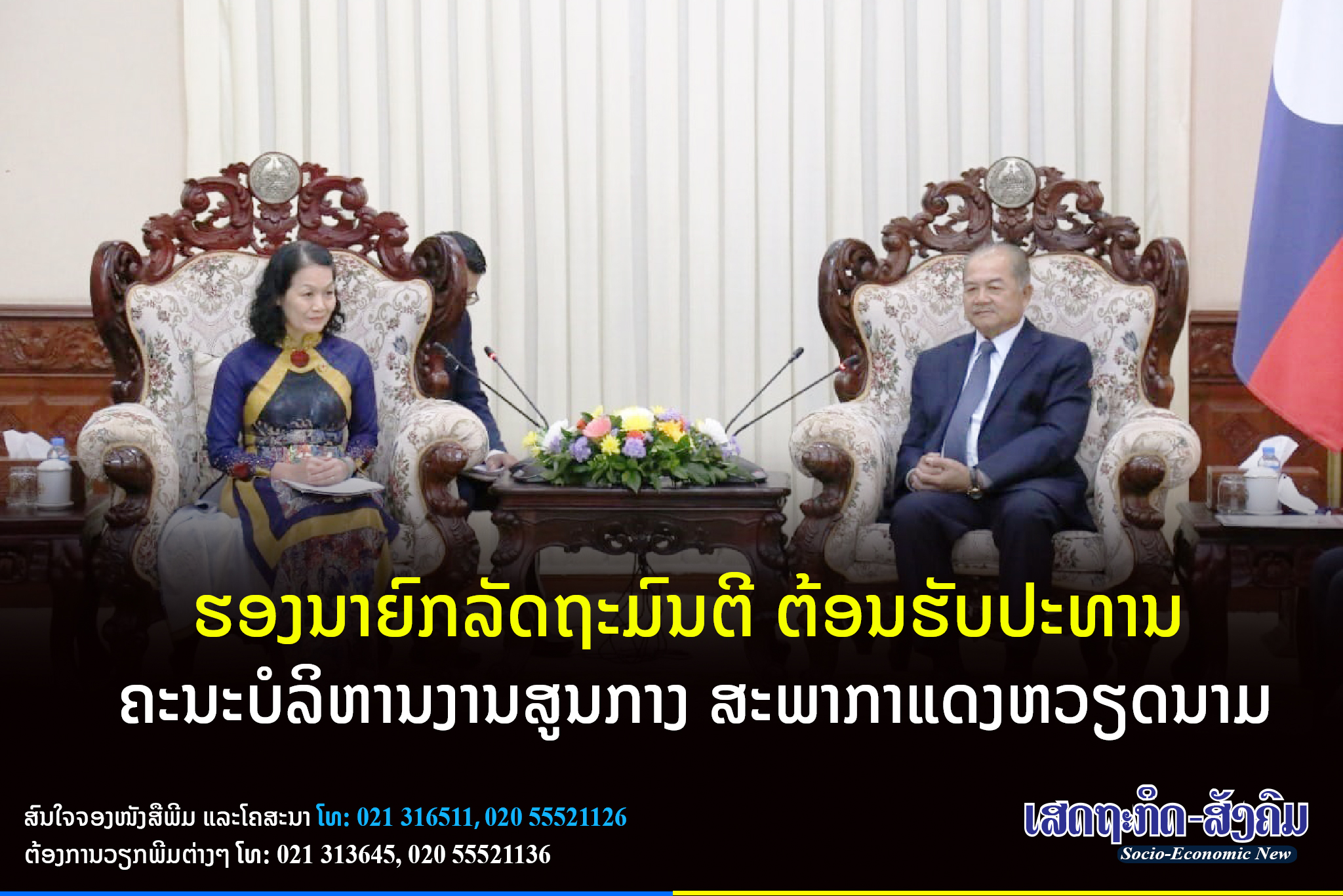 ໃນວັນທີ 27 ຕຸລາ 2022 ທີ່ສຳນັກງານນາຍົກລັດຖະມົນຕີ ທ່ານ ກິແກ້ວ ໄຂຄຳພິທູນ ຮອງນາຍົກລັດຖະມົນຕີແຫ່ງ ສປປ ລາວ ໄດ້ຕ້ອນຮັບການເຂົ້າຢ້ຽມຂໍ່ານັບຂອງທ່ານ ນາງ ບຸ່ຍ ທິ ຮວາ ປະທານຄະນະບໍລິຫານງານສູນກາງສະພາກາແດງຫວຽດນາມໃນໂອກາດທີ່ເດີນທາງມາຢ້ຽມຢາມ ແລະເຮັດວຽກຢູ່ ສປປ ລາວ.