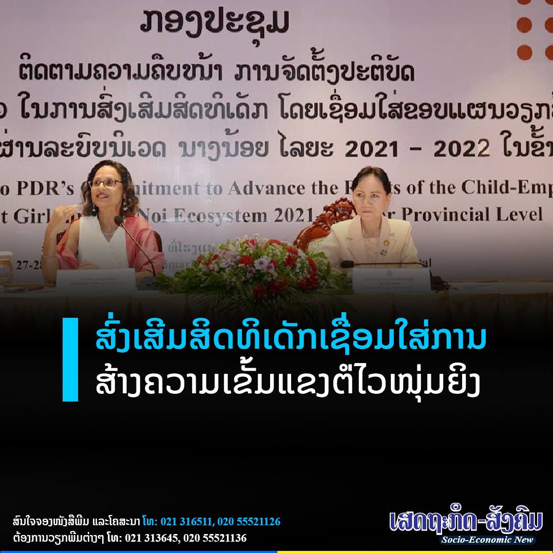 ກອງປະຊຸມຕິດຕາມຄວາມຄືບໜ້າການຈັດຕັ້ງປະຕິບັດຄວາມໝາຍໝັ້ນໃນການສົ່ງເສີມສິດທິເດັກ ເຊື່ອມຕໍ່ການສ້າງຄວາມເຂັ້ມແຂງໃຫ້ໄວໜຸ່ມຍິງຜ່ານລະບົບນິເວດນາງນ້ອຍ 2021-2025 ຂັ້ນແຂວງໄດ້ຈັດຂຶ້ນໃນວັນທີ 27 ຕຸລານີ້ ທີ່ໂຮງແຮມແລນມາກ ນະຄອນຫຼວງວຽງຈັນ,