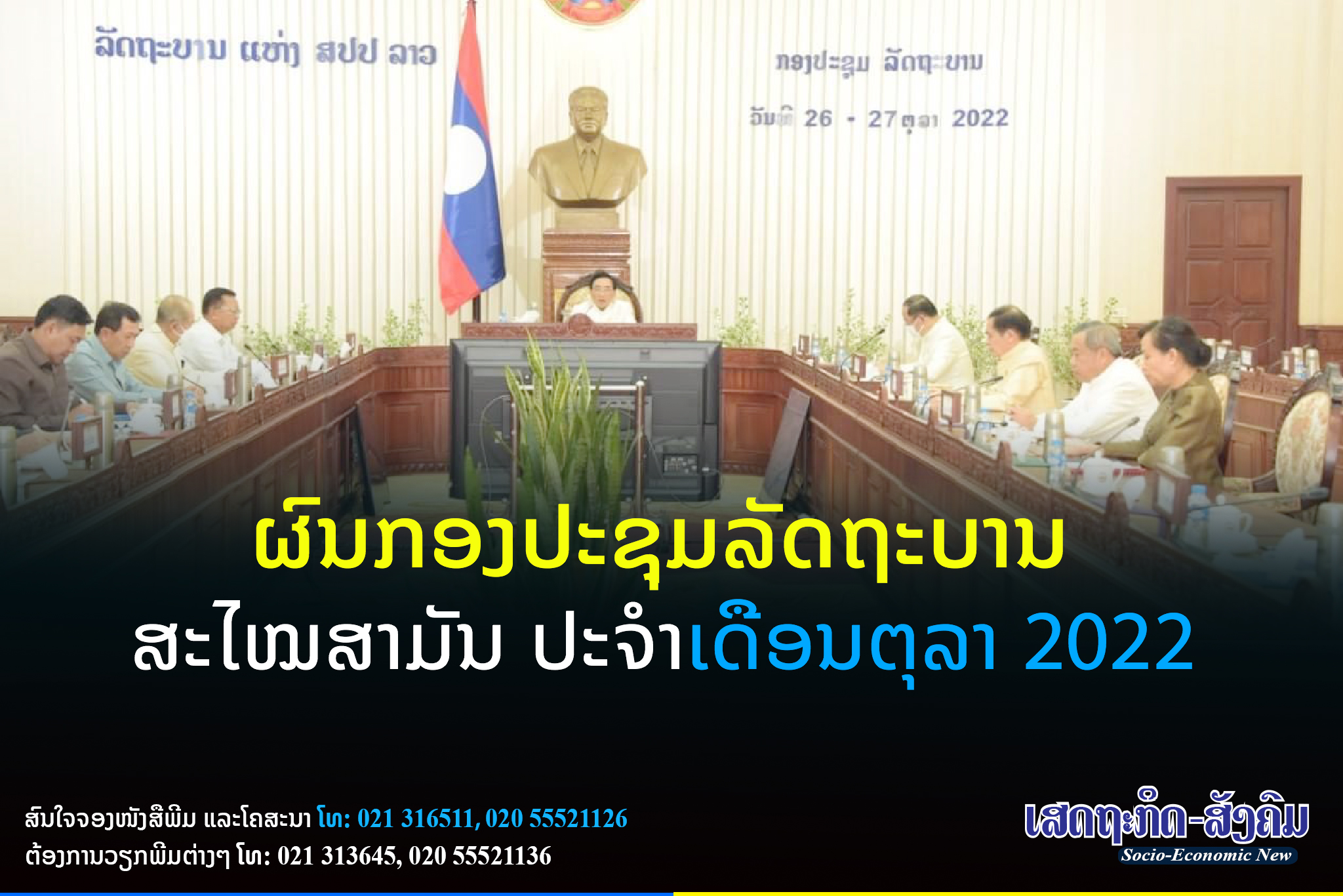 ກອງປະຊຸມລັດຖະບານ ປະຈໍາເດືອນ ຕຸລາ 2022 ໄດ້ໄຂຂຶ້ນ ໃນຕອນເຊົ້າຂອງວັນທີ 26 ຕຸລາ ແລະອັດລົງໃນວັນທີ 27 ຕຸລາ 2022 ທີ່ສໍານັກງານນາຍົກລັດຖະມົນຕີ ພາຍໃຕ້ການເປັນປະທານຂອງ ທ່ານ ພັນຄຳ ວິພາວັນ ນາຍົກລັດຖະມົນຕີ,