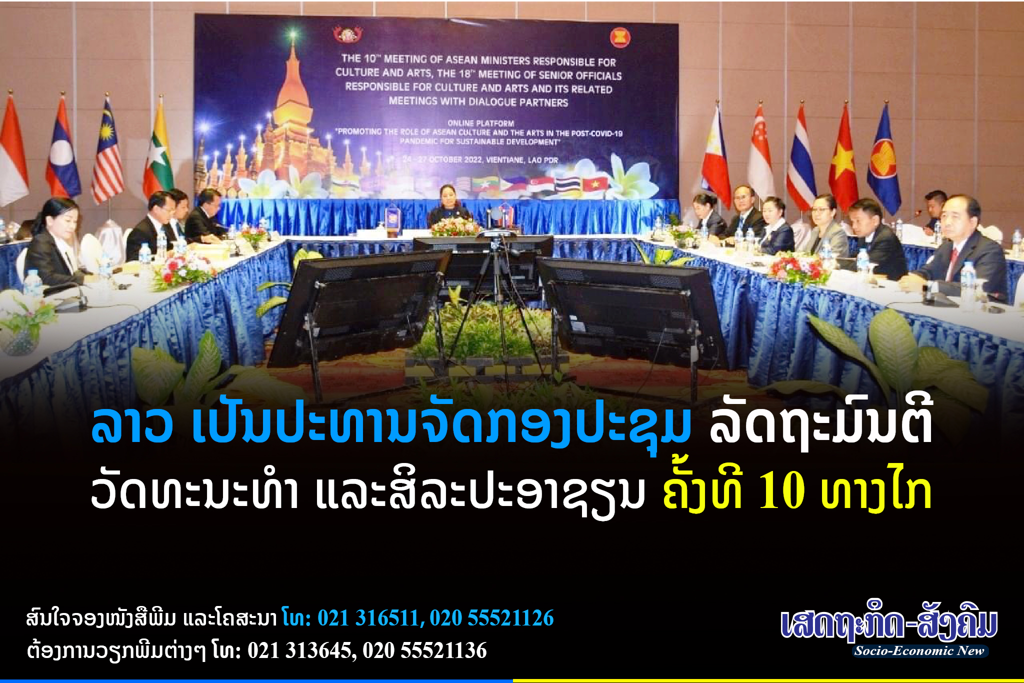 ວັນທີ 27 ຕຸລາ 2022, ນະຄອນຫລວງວຽງຈັນກອງປະຊຸມລັດຖະມົນຕີ ວັດທະນະທໍາ ແລະສິລະປະອາຊຽນຄັ້ງທີ 10 ແລະ ກອງປະຊຸມກ່ຽວຂ້ອງໃນຮູບແບບທາງໄກໂດຍການເປັນປະທານຂອງທ່ານ ນາງ ສວນສະຫວັນ ວິຍະເກດ ລັດຖະມົນຕີກະຊວງຖະແຫລງຂ່າວ,