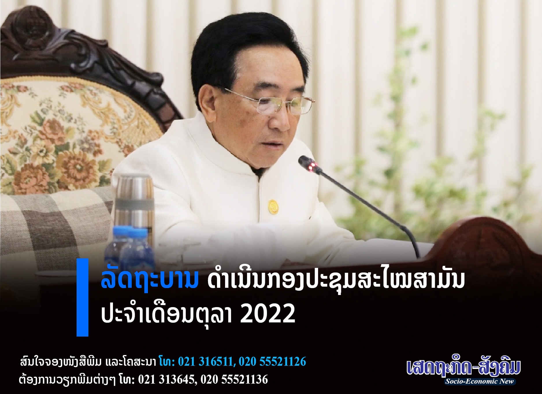 ກອງປະຊຸມລັດຖະບານ ສະໄໝສາມັນ ປະຈຳເດືອນຕຸລາ 2022 ໄດ້ໄຂຂຶ້ນໃນວັນທີ 26 ຕຸລາ 2022 ທີ່ສໍານັກງານນາຍົກລັດຖະມົນຕີ, ພາຍໃຕ້ການເປັນປະທານຂອງ ທ່ານ ພັນຄໍາ ວິພາວັນນາຍົກລັດຖະມົນຕີ, ມີບັນດາທ່ານຮອງນາຍົກລັດຖະມົນຕີ, ສະມາຊິກລັດຖະບານ ແລະຜູ້ຕາງໜ້າຈາກບັນດາກະຊວງເຂົ້າຮ່ວມ.