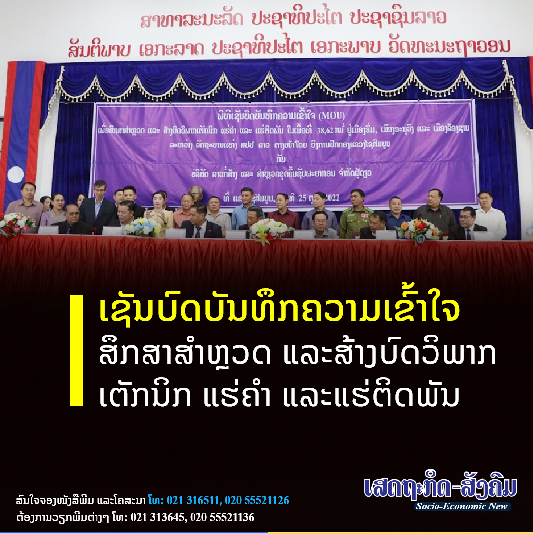ວັນທີ 25 ຕຸລາ 2022 ທີ່ຫ້ອງປະຊຸມຫ້ອງວ່າການແຂວງອົງການປົກຄອງແຂວງໄຊສົມບູນ ແລະບໍລິສັດ ລາວກໍ່ສ້າງ ແລະສຳຫຼວດຂຸດຄົ້ນຊັບພະຍາກອນ ຈຳກັດຜູ້ດຽວ ໄດ້ເຊັນບົດບັນທຶກຄວາມເຂົ້າໃຈ MOU ເພື່ອສຶກສາສຳຫຼວດ ແລະສ້າງບົດວິພາກເຕັກນິກ ແຮ່ຄຳ