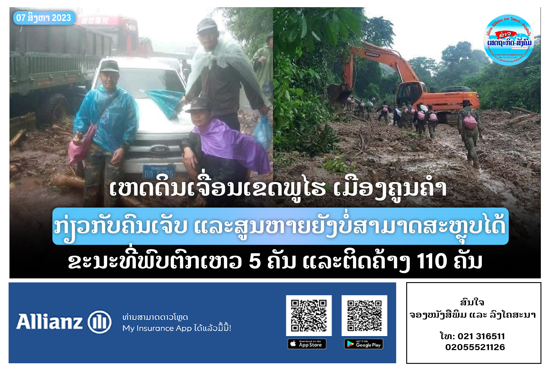 ເຫດດິນເຈື່ອນເຂດພູໄຮ ເມືອງຄູນຄໍາ ຍັງບໍ່ສາມາດສະຫຼຸບໄດ້ກ່ຽວກັບຄົນເຈັບ ແລະສູນຫາຍ ຂະນະທີ່ພົບຕົກເຫວ 5 ຄັນ ແລະຕິດຄ້າງ 110 ຄັນ