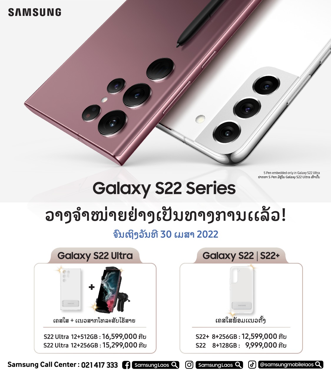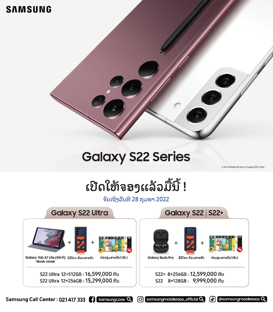 ວາງຈຳໜ່າຍແລ້ວໃນລາວ! ສະມາດໂຟນຊຳຊຸງລຸ້ນລ່າສຸດ Galaxy S22 Series ດ້ວຍຄຸນສົມບັດທີ່ທັນສະໄໝທະລຸທຸກຂີດຈໍາກັດຂອງໂທລະສັບມືຖືລະດັບ Flagship ທັງດ້ານການປະມວນຜົນການອອກແບບ ແລະປະສິດທິພາບຂອງກ້ອງ