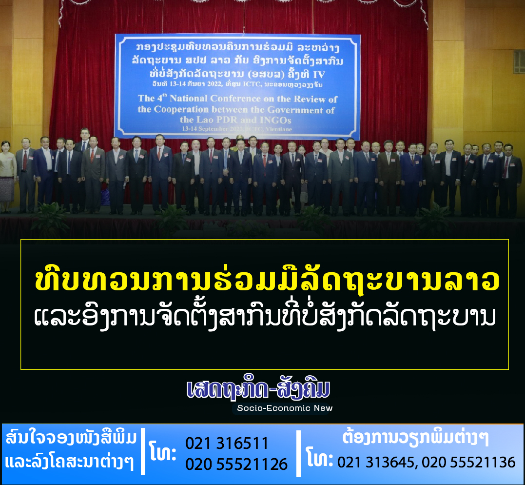 ໃນຕອນເຊົ້າຂອງວັນທີ 13 ກັນຍາ 2022 ທີ່ ນະຄອນຫລວງວຽງຈັນ, ໄດ້ຈັດກອງປະຊຸມທົບທວນຄືນການຮ່ວມມືລະຫວ່າງລັດຖະບານ ສປປ ລາວ ກັບຄະນະກຳມະການຄຸ້ມຄອງອົງການຈັດຕັ້ງສາກົນທີ່ບໍ່ສັງກັດລັດຖະບານ(ອສບລ) ຄັ້ງທີ IV ຢ່າງເປັນທາງການ.