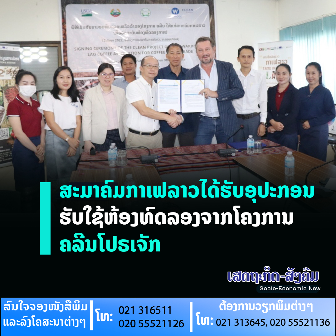 ພິທີເຊັນສັນຍາມອບ-ຮັບ ການຊ່ວຍເຫຼືອຈາກໂຄງການສ້າງຄວາມເຊື່ອມໂຍງເພື່ອຂະຫຍາຍເຄືອຂ່າຍກະສິກຳ ຫຼືຄລີນ ໂປຣເຈັກ(clean projact) ໃຫ້ແກ່ສະມາຄົມກາເຟລາວ ເພື່ອປັບປຸງຍົກລະດັບຫ້ອງທົດລອງກາເຟ ຈັດຂຶ້ນໃນວັນທີ 12 ກັນຍາ ຜ່ານມາ,