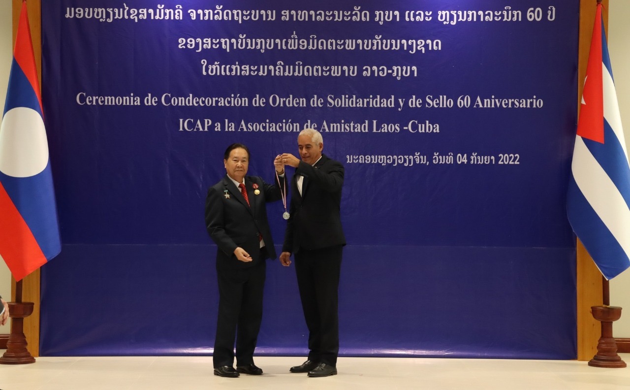 ພິທີມອບຫລຽນໄຊສາມັກຄີ ຈາກລັດຖະບານ ສ ກູບາ ແລະຫຼຽນກາລະນຶກ 60 ປີ ຈາກສະຖາບັນກູບາເພື່ອມິດຕະພາບກັບນາໆຊາດ (ICAP) ໃຫ້ແກ່ສະມາຄົມມິດຕະພາບ ລາວ-ກູບາ ຈັດຂຶ້ນໃນວັນທີ 4 ກັນຍາ 2022, ທີ່ຫໍສະພາແຫ່ງຊາດ,