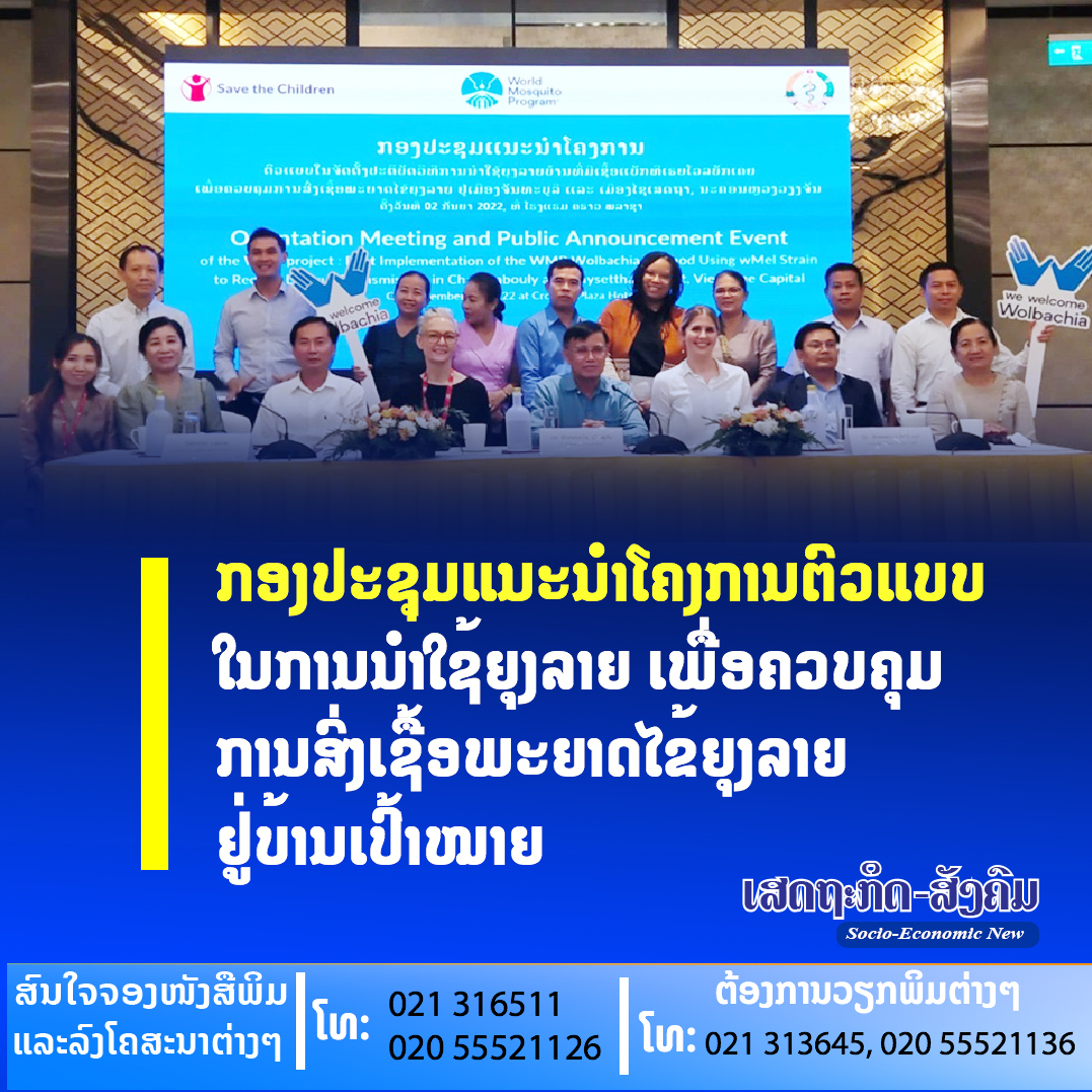 ກອງປະຊຸມແນະນໍາໂຄງການທົດລອງຈັດຕັ້ງປະຕິບັດວິທີການນໍາໃຊ້ຍຸງລາຍບ້ານທີ່ມີເຊື້ອແບັກທີເຣຍ ໂວສບັກເຄຍ (Wolbachia) ເພື່ອຄວບຄຸມການສົ່ງເຊື້ອພະຍາດໄຂ້ຍຸງລາຍ ຢູເມືອງຈັນທະບູລີ ແລະ ເມືອງໄຊເສດຖານະຄອນຫລວງວຽງຈັນ