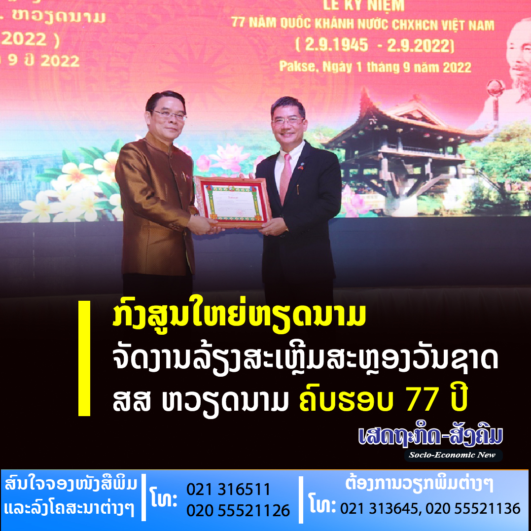 ເມື່ອວັນທີ 1 ກັນຍາ 2022 ທີ່ນະຄອນປາກເຊ ແຂວງຈໍາປາສັກ, ກົງສູນໃຫຍ່ ສສ ຫວຽດນາມ ປະຈຳພາກໃຕ້ລາວ ປາກເຊໄດ້ຈັດງານລ້ຽງສະເຫຼີມສະຫຼອງວັນຊາດ ສສ ຫວຽດນາມ ຄົບຮອບ 77 ປີ ( 2 ສິງຫາ 1945 – 2 ສິງຫາ 2022 ) ດ້ວຍບັນຍາກາດອັນຄຶກຄື້ນ.