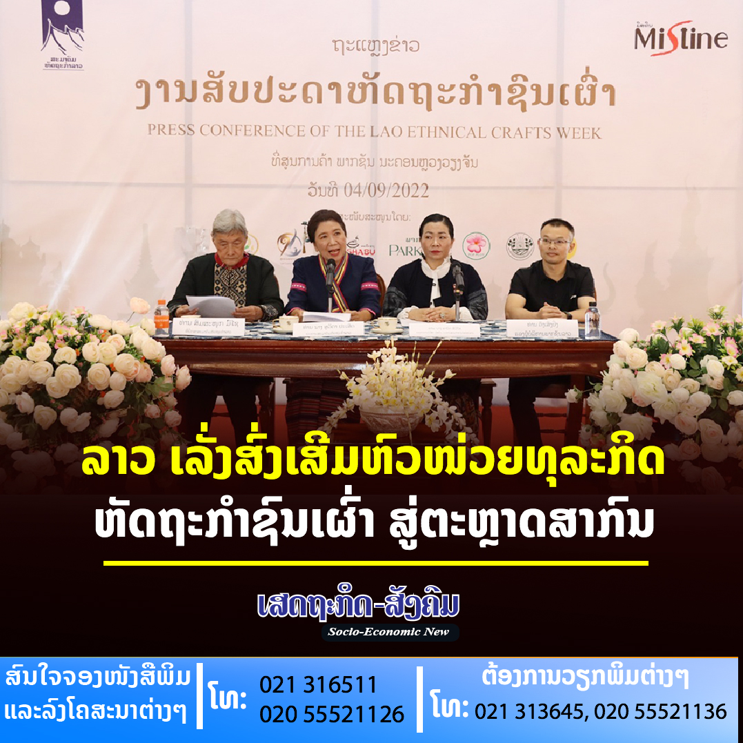ສະມາຄົມຫັດຖະກຳລາວຮ່ວມກັບບໍລິສັດມິສທິນກ້າວໜ້າລາວ ຈຳກັດ ຈະຈັດງານສັບປະດາຫັດຖະກຳຊົນເຜົ່າ(Lao Ethnical Crafts Week), ໃນລະຫວ່າງວັນທີ 8-18 ກັນຍາ 2022 ນີ້, ຢູ່ສູນການຄ້າພາກຊັນ ນະຄອນຫລວງວຽງຈັນ