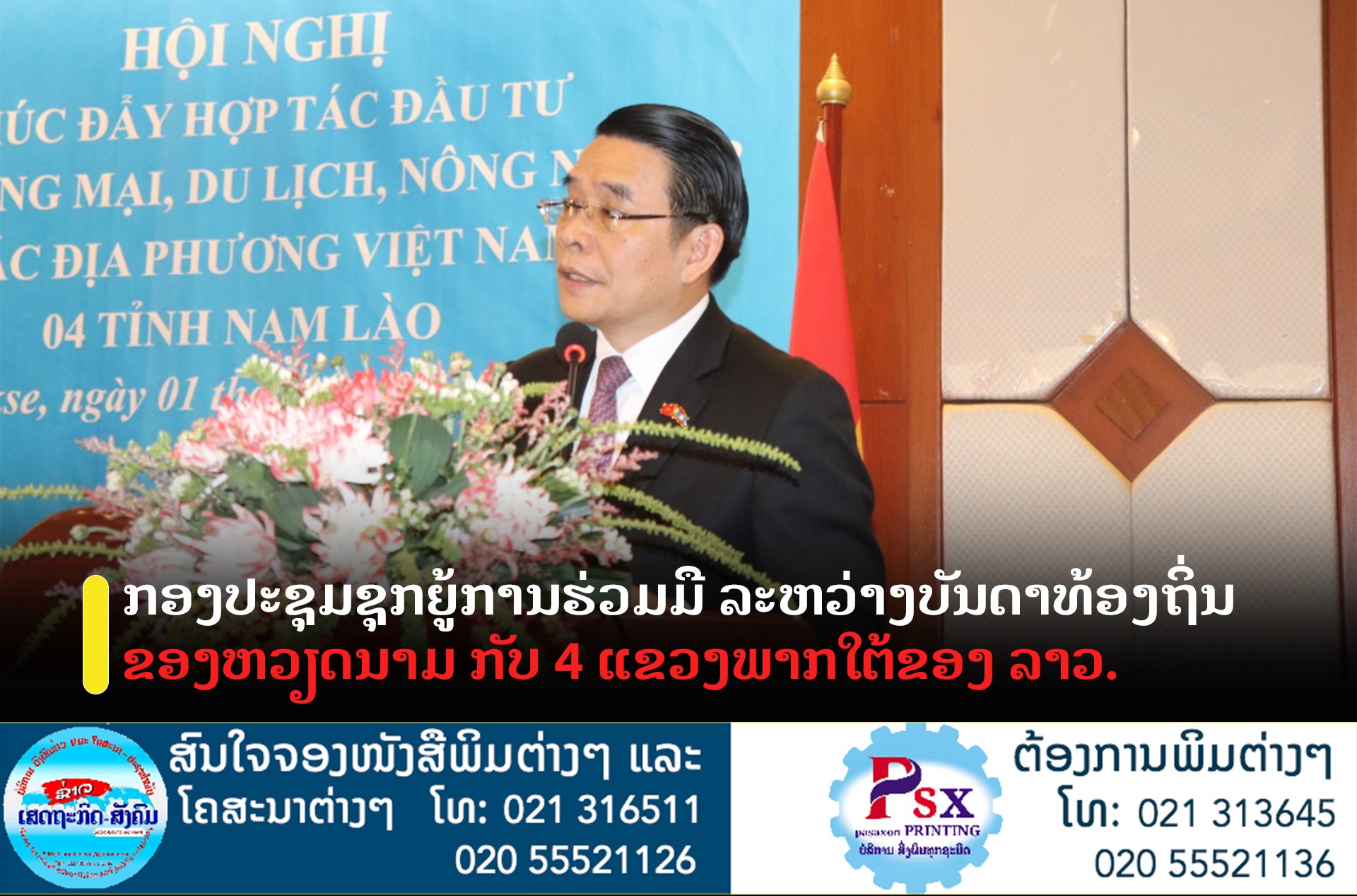 ໃນວັນທີ 1 ກັນຍາ 2022 ຢູ່ທີ່ໂຮງແຮມຈໍາປາສັກແກຣນ ນະຄອນປາກເຊ ແຂວງຈໍາປາສັກ ມີກອງປະຊຸມຊຸກຍູ້ການຮ່ວມມືລົງທຶນດ້ານການຄ້າ, ການທ່ອງທ່ຽວ, ກະສີກໍາລະຫວ່າງບັນດາທ້ອງຖິ່ນຂອງ ສສ ຫວຽດນາມ