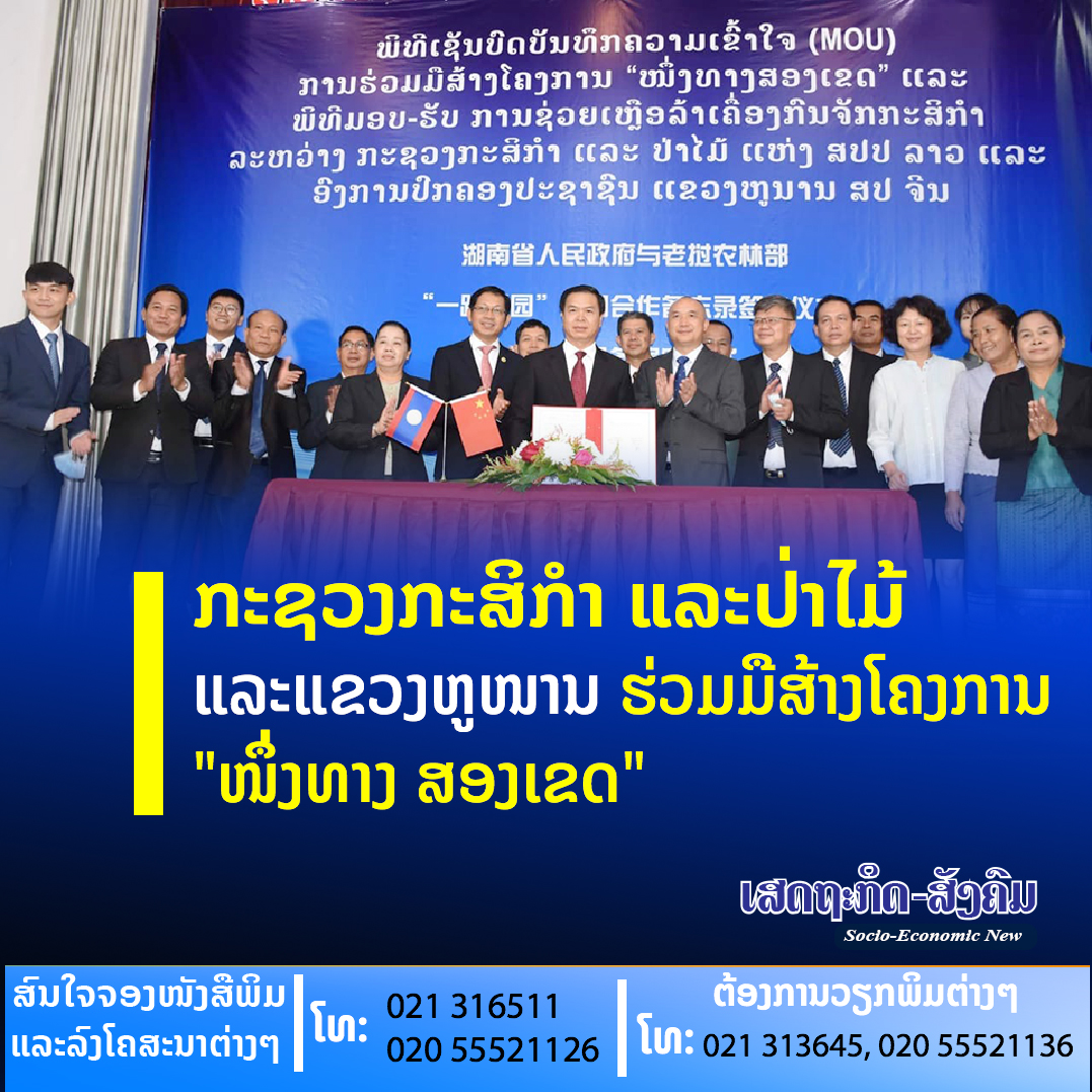 ວັນທີ 26 ສິງຫາ ຜ່ານມາ ທີ່ນະຄອນຫຼວງວຽງຈັນ ໄດ້ມີພິທີເຊັນບົດບັນທຶກຄວາມເຂົ້າໃຈ ການຮ່ວມມືສ້າງໂຄງການ “ໜຶ່ງທາງ ສອງເຂດ” ແລະພິທີມອບ-ຮັບ ການຊ່ວຍເຫຼືອລ້າເຄື່ອງກົນຈັກກະສິກຳ ລະຫວ່າງກະຊວງກະສິກໍາ ແລະ ປ່າໄມ້ ສປປ ລາວ