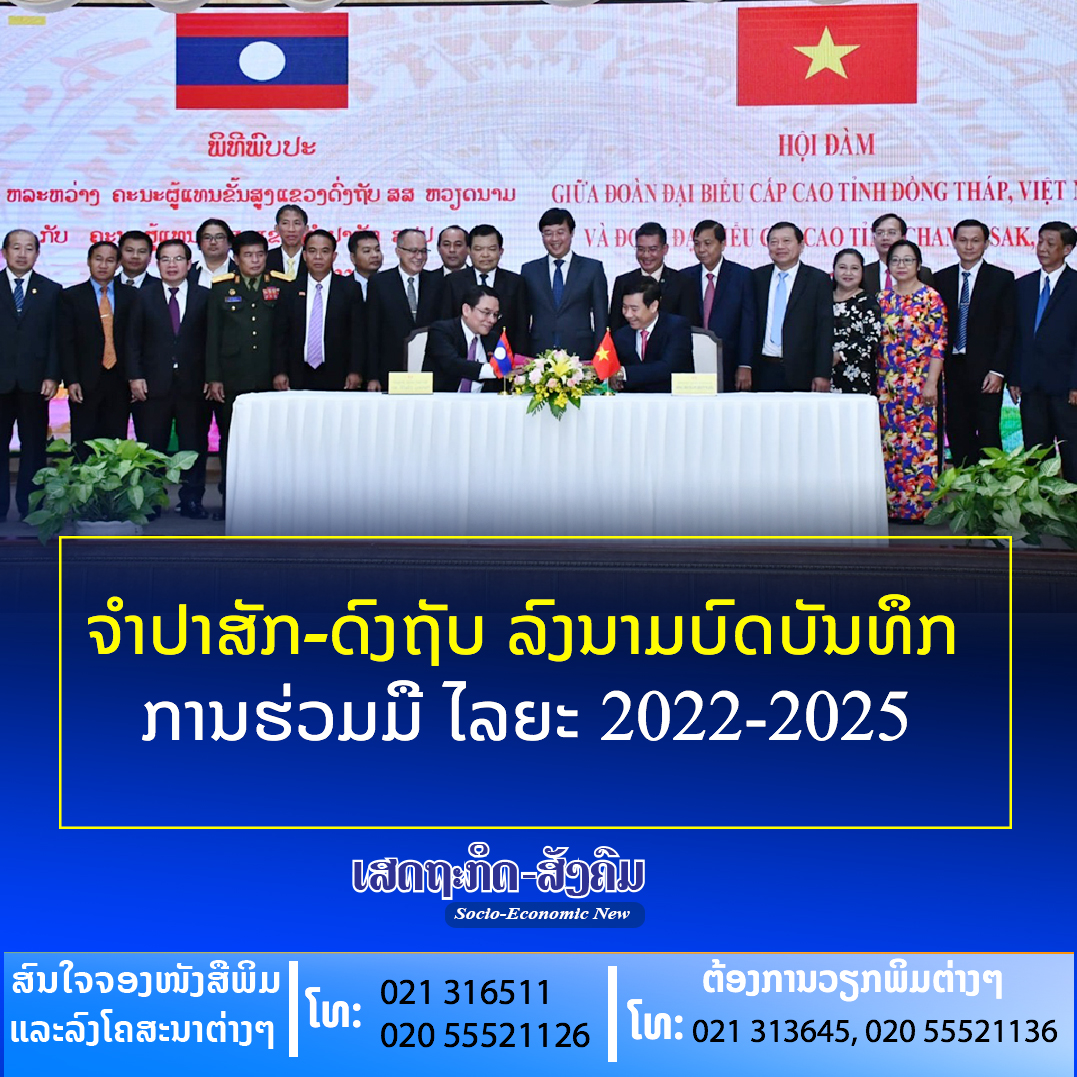 ໃນວັນທີ 27 ສິງຫາ ຜ່ານມາ, ຢູ່ແຂວງດົ່ງຖັບ ສສ ຫວຽດນາມ ໄດ້ມີກອງປະຊຸມພົບປະ ແລະລົງນາມບົດບັນທຶກຊ່ວຍຈຳການຮ່ວມມື ລະຫ່ວາງ ແຂວງຈຳປາສັກ ສປປ ລາວ ແລະ ແຂວງດົງຖັບ ທ່ານ ຫວຽດນາມ ໄລຍະປີ 2022-2025,