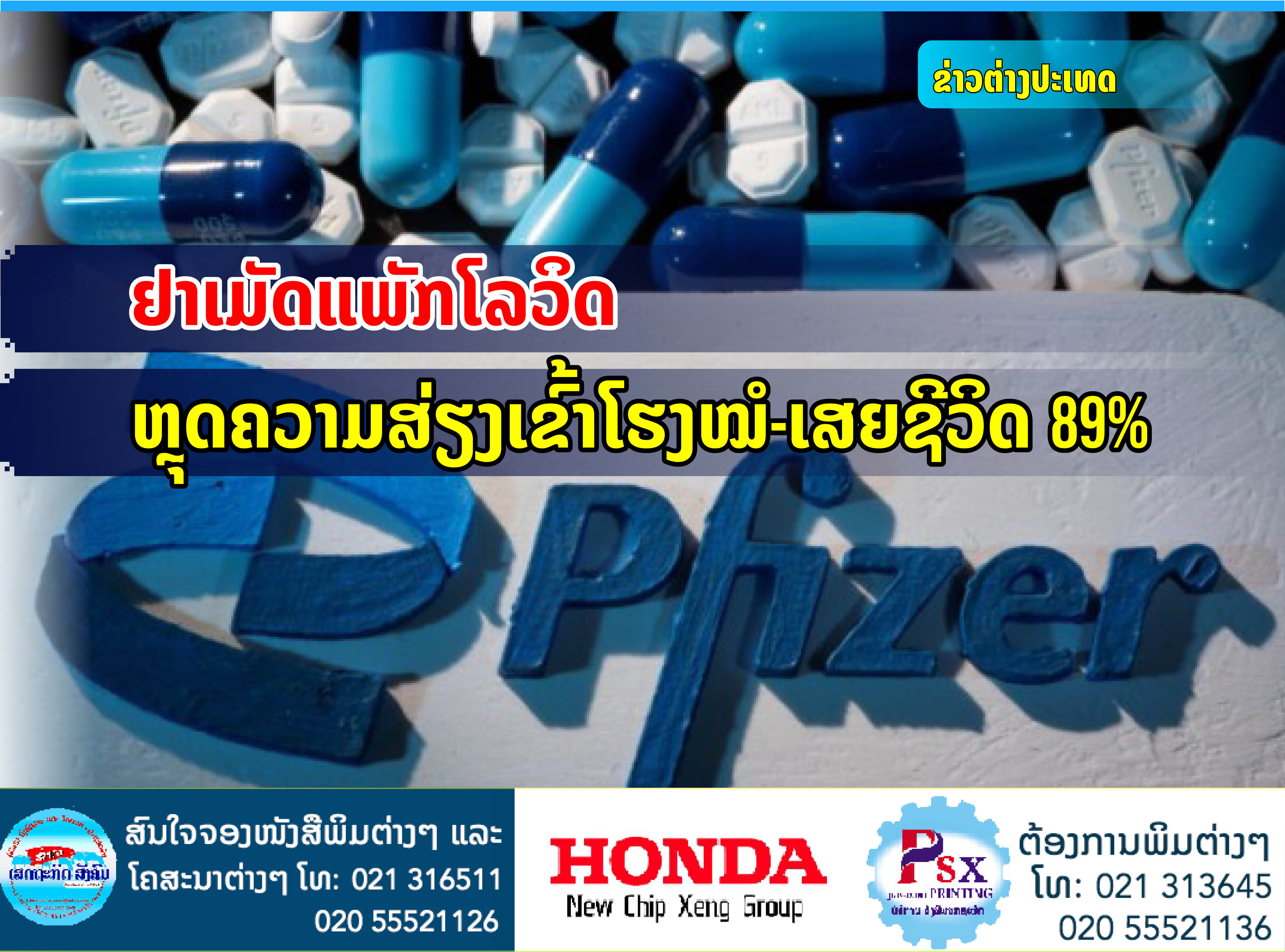ບໍລິສັດໄຟເຊີປະກາດຄວາມສຳເລັດຢາເມັດປິ່ນປົວພະຍາດໂຄວິດ-19 ຫຼຸດຄວາມສ່ຽງເຂົ້າໂຮງໝໍ ແລະການເສຍຊີວິດໃນຄົນເຈັບໄດ້ເຖິງ 89% ກຽມຂໍອະນຸມັດໃຊ້ສຸກເສີນໃນອາເມລິກາ.