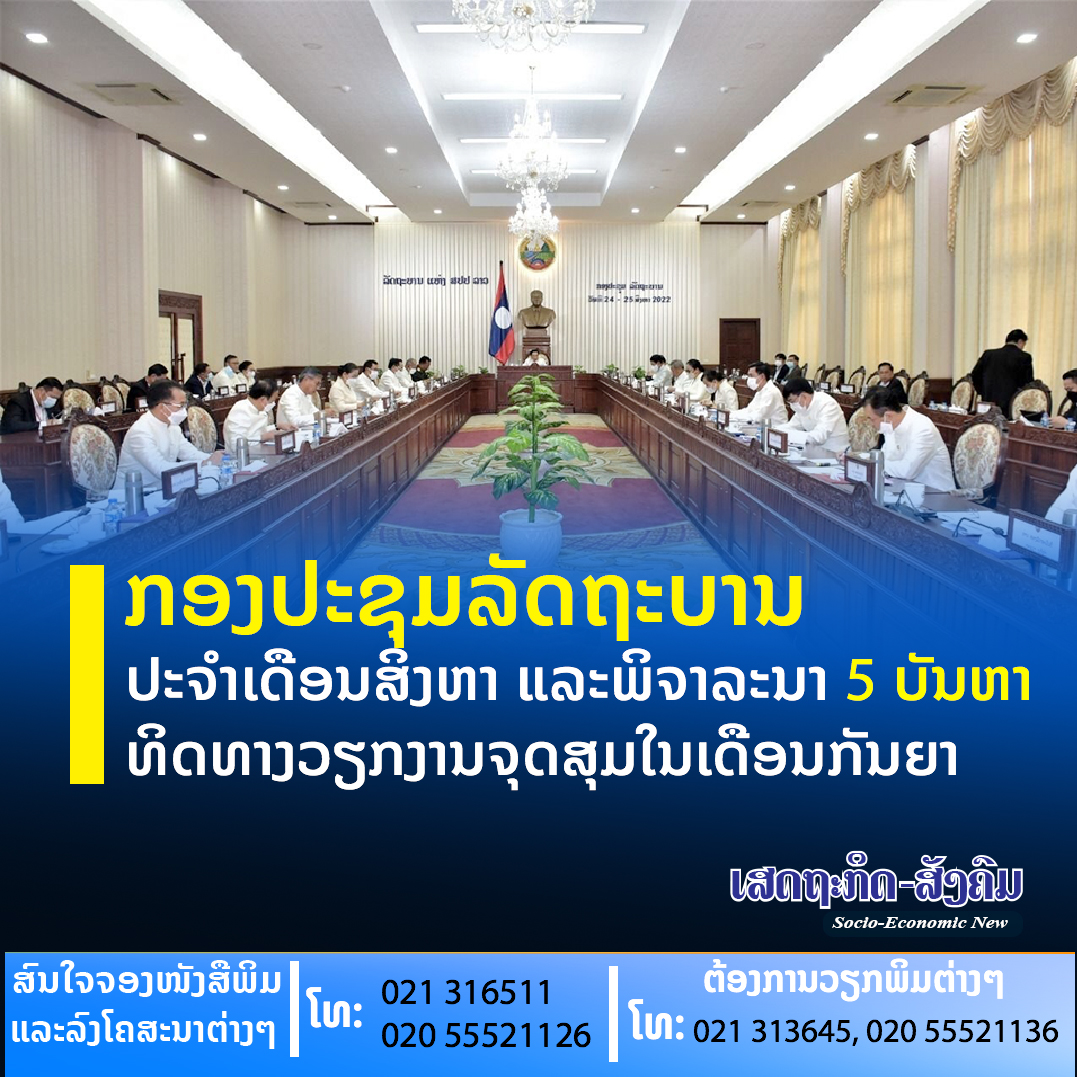 ເມື່ອວັນທີ 24 ສິງຫາ 2022 ໄຂກອງປະຊຸມລັດຖະບານ ປະຈຳເດືອນສິງຫາ 2022 ໄດ້ໄຂຂຶ້ນພາຍໃຕ້ການເປັນປະທານຂອງທ່ານ ພັນຄຳ ວິພາວັນ ນາຍົກລັດຖະມົນຕີ; ມີບັນດາທ່ານຮອງນາຍົກລັດຖະມົນຕີ, ສະມາຊິກ ລັດຖະບານ ແລະຜູ້ຕາງໜ້າຈາກບັນດາກະຊວງເຂົ້າຮ່ວມ.