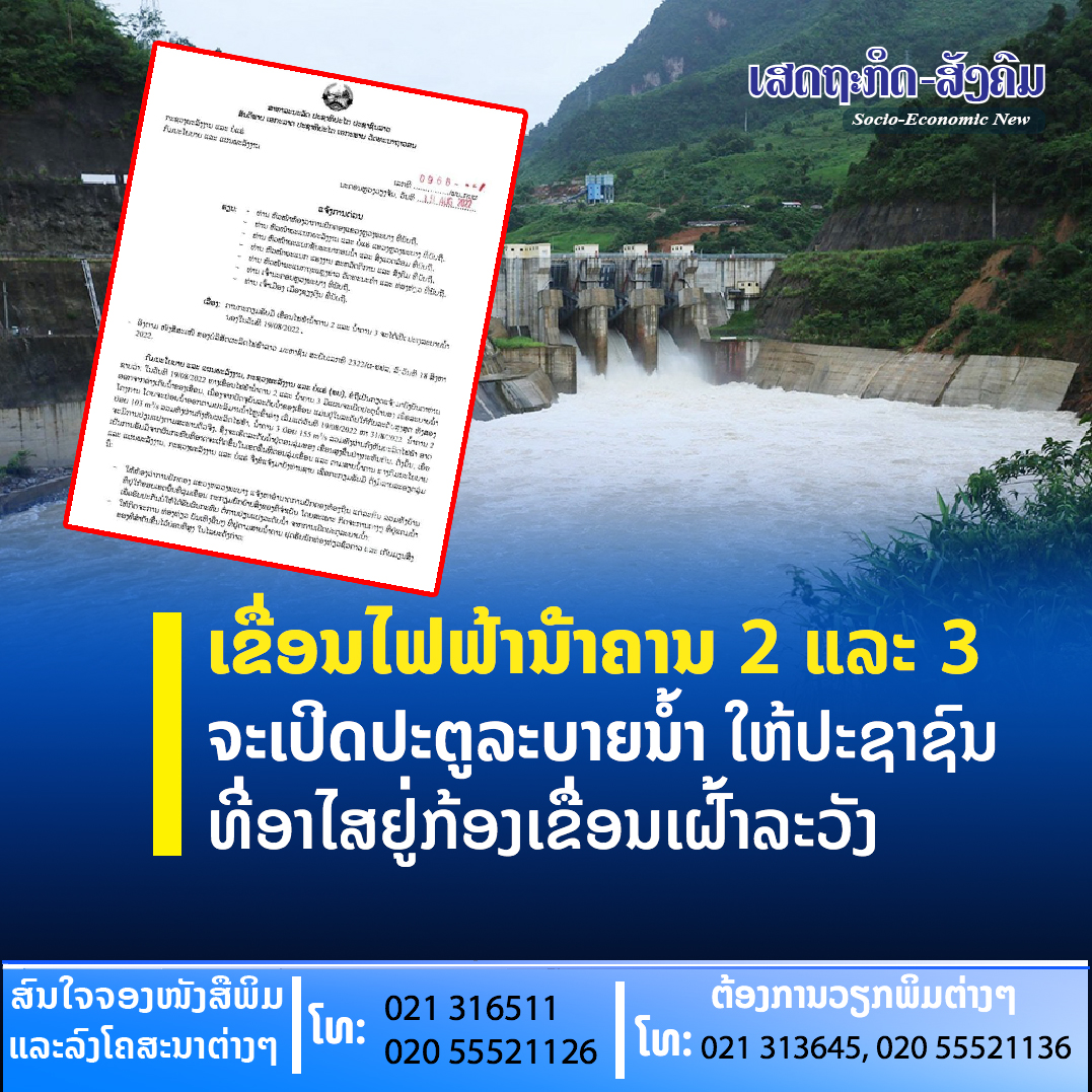 ກົມນະໂຍບາຍ ແລະແຜນພະລັງງານກະຊວງພະລັງງານ ແລະບໍ່ແຮ່ ໃຫ້ຮູ້ວ່າ: ໃນວັນທີ 19-31 ສິງຫາ 2022 ເຂື່ອນໄຟຟ້ານໍ້າຄານ 2 ແລະນໍ້າຄານ 3 ຢູ່ແຂວງຫລວງພະບາງ ຈະເປີດປະຕູນໍ້ານອງ ເພື່ອລະບາຍນໍ້າອອກຈາກອ່າງເກັບນໍ້າຂອງເຂື່ອນ,