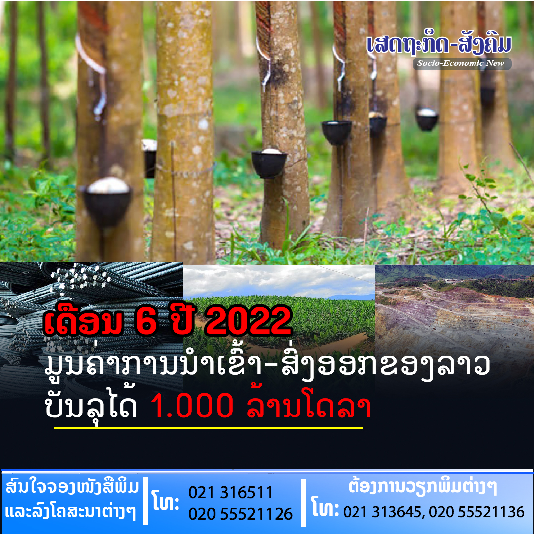 ຕາມຂໍ້ມູນຂ່າວສານທາງການຄ້າຂອງ ສປປ ລາວ ໃຫ້ຮູ້ວ່າ: ມູນຄ່າການນໍາເຂົ້າ ແລະສົ່ງອອກ ຂອງ ສປປ ລາວ ປະຈໍາເດືອນ 6 ປີ 2022 ບັນລຸໄດ້ປະມານ 1.000 ລ້ານໂດລາສະຫະລັດ. ໃນນັ້ນ, ມູນຄ່າການສົ່ງອອກ ມີປະມານ 456 ລ້ານໂດລາສະຫະລັດ,