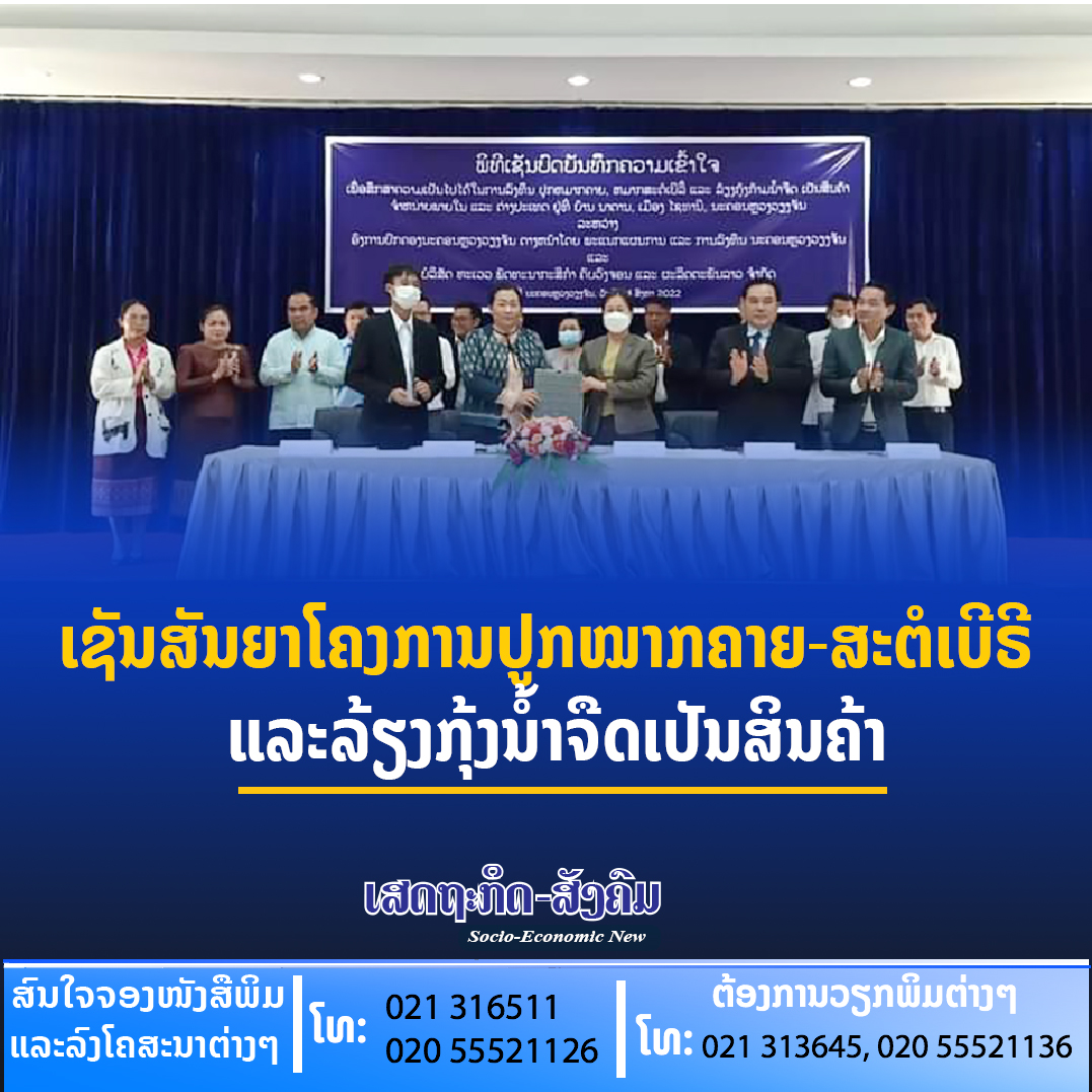 ພິທີເຊັນບົດບັນທຶກຄວາມເຂົ້າໃຈ ເພື່ອສຶກສາຄວາມເປັນໄປໄດ້ໃນໂຄງການປູກໝາກຄາຍ, ໝາກສະຕໍເບີຣີ ແລະລ້ຽງກຸ້ງນໍ້າຈືດເປັນສິນຄ້າຈໍາໜ່າຍພາຍໃນ ແລະຕ່າງປະເທດຢູ່ທີ່ບ້ານນາຕານ ເມືອງໄຊທານີ ນະຄອນຫຼວງວຽງຈັນ (ນວ)