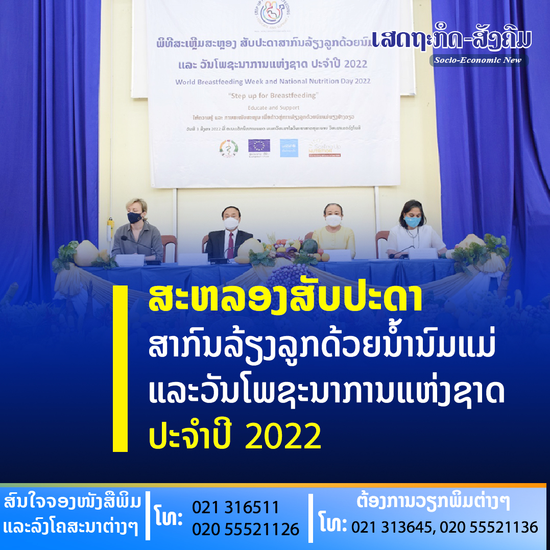 ໃນວັນທີ 3 ສິງຫາ 2022 ກະຊວງສາທາລະນະສຸກ ແລະສະຫະພາບເອີຣົບ, ອົງການອຸຍນີເຊບຈັດງານສະເຫລີມສະຫລອງສັບປະດາສາກົນລ້ຽງລູກດ້ວຍນໍ້ານົມແມ່ ແລະ ວັນໂພຊະນາການແຫ່ງຊາດໂດຍການເປັນປະທານຂອງທ່ານ ບຸນແຝງ ພູມມະໄລສິດ ລັດຖະມົນຕີກະຊວງສາທາລະນະສຸກ,