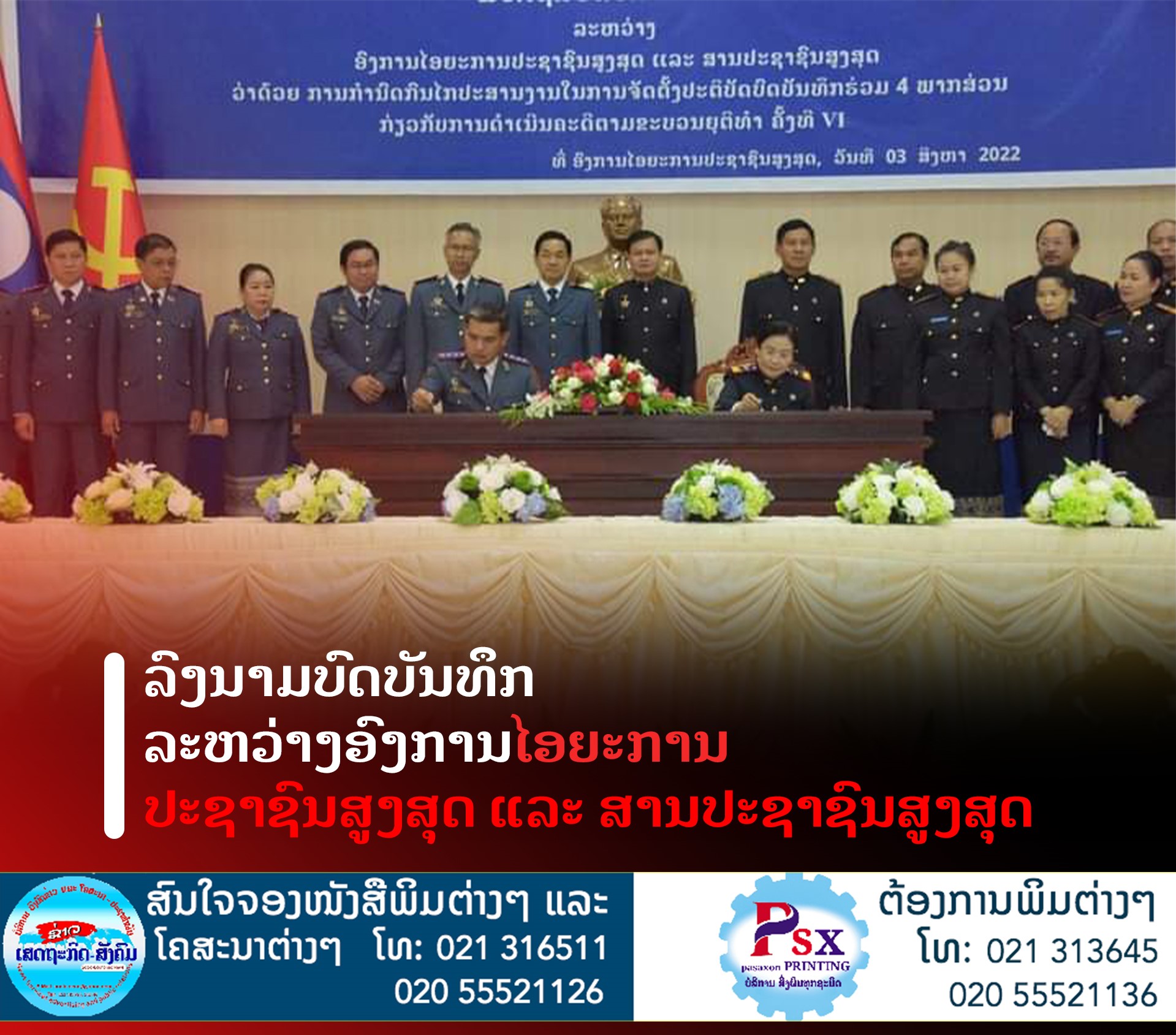 ໃນວັນທີ 3 ສິງຫາ ນີ້ ທີ່ ອົງການໄອຍະການປະຊາຊົນສູງສຸດ ໄດ້ຈັດພິທີລົງນາມບົດບັນທຶກການກຳນົດກົນໄກປະສານງານໃນການຈັດຕັ້ງປະຕິບັດບົດບັນທຶກຮ່ວມ 4 ພາກສ່ວນ