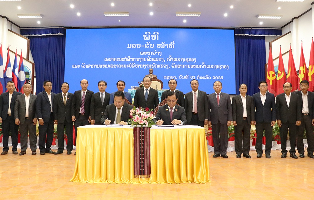 ພິທີມອບ-ຮັບໜ້າທີ່ລະຫວ່າງ ສະຫາຍ ເຫຼັກໄຫລ ສີວິໄລ ເລຂາຄະນະບໍລິຫານງານພັກແຂວງ-ເຈົ້າແຂວງເຊກອງ (ຜູ້ເກົ່າ) ແລະສະຫາຍ ບຸນຫຼາຍ ບຸດທິ ຮັກສາການເລຂາພັກແຂວງ-ເຈົ້າແຂວງເຊກອງ