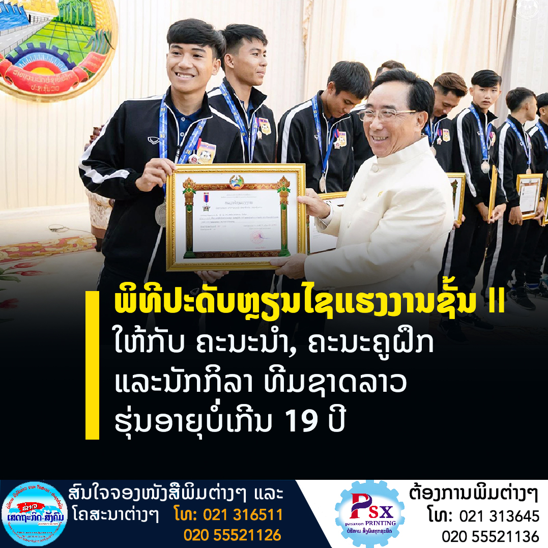 ຕອນບ່າຍວັນທີ 19 ກໍລະກົດ 2022 ຢູ່ທີ່ ຫ້ອງວ່າການສຳນັກງານນາຍົກລັດຖະມົນຕີ, ໄດ້ມີພິທີປະດັບຫຼຽນໄຊແຮງງານຊັ້ນ II ຄະນະນຳ, ຄະນະຄູຝຶກ ແລະນັກກິລາ ທີມຊາດລາວ ຮຸ່ນອາຍຸບໍ່ເກີນ 19 ປີ ໄດ້ ຮອງແຊ້ມ ການແຂ່ງຂັນບານເຕະຊາຍຊີງແຊ້ມອາຊຽນ ຮຸ່ນອາຍຸບໍ່ເກີນ 19 ປີ