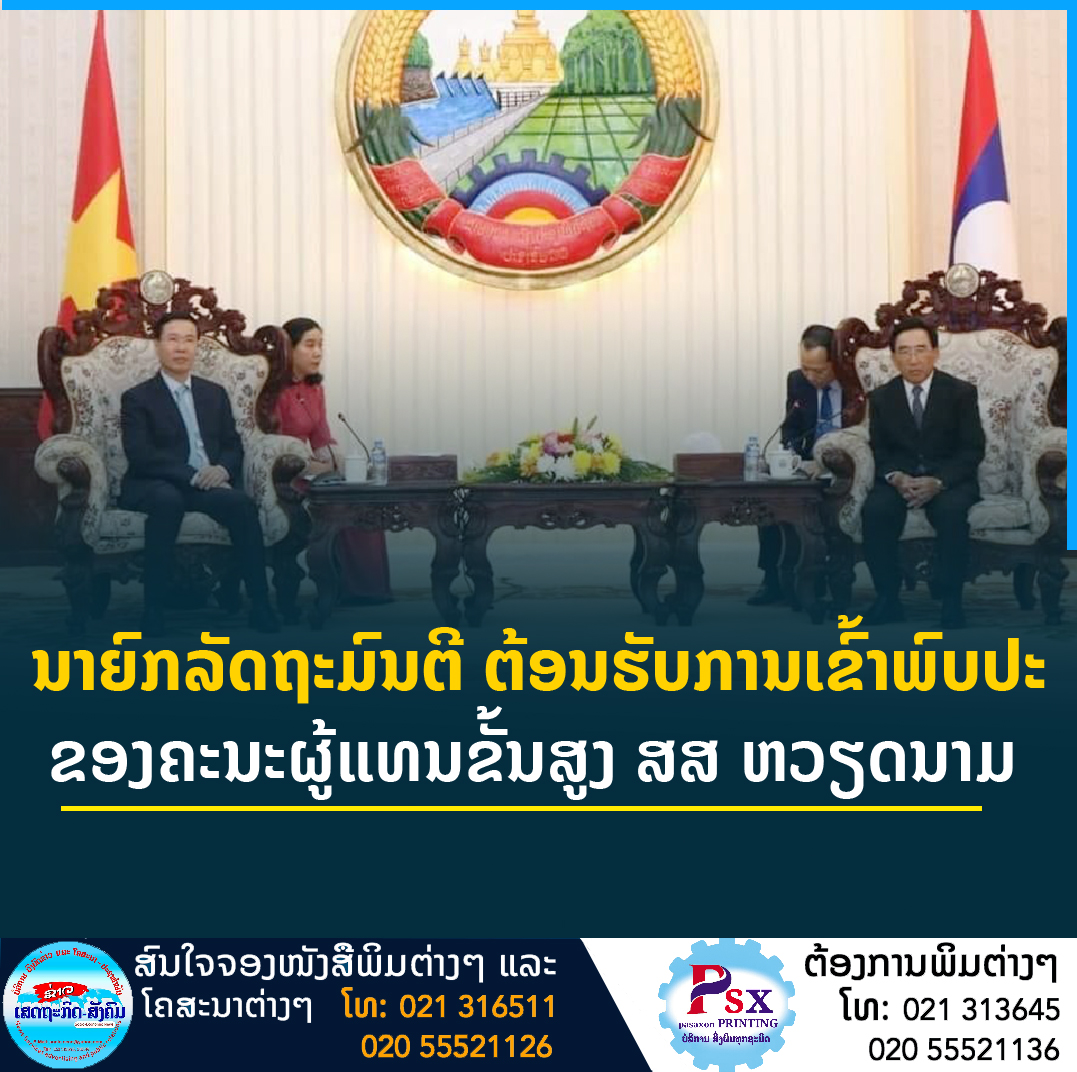 ໃນວັນທີ 17 ກໍລະກົດ 2022 ທີ່ສຳນັກງານນາຍົກລັດຖະມົນຕີ, ສະຫາຍ ພັນຄຳ ວິພາວັນ ກຳມະການກົມການເມືອງສູນກາງພັກ, ນາຍົກລັດຖະມົນຕີ ແຫ່ງ ສປປ ລາວ ໄດ້ຕ້ອນຮັບການເຂົ້າພົບປະຂອງ ສະຫາຍ ຫວໍ ວັນ ເຖື້ອງ, ກຳມະການກົມການເມືອງສູນກາງພັກ,