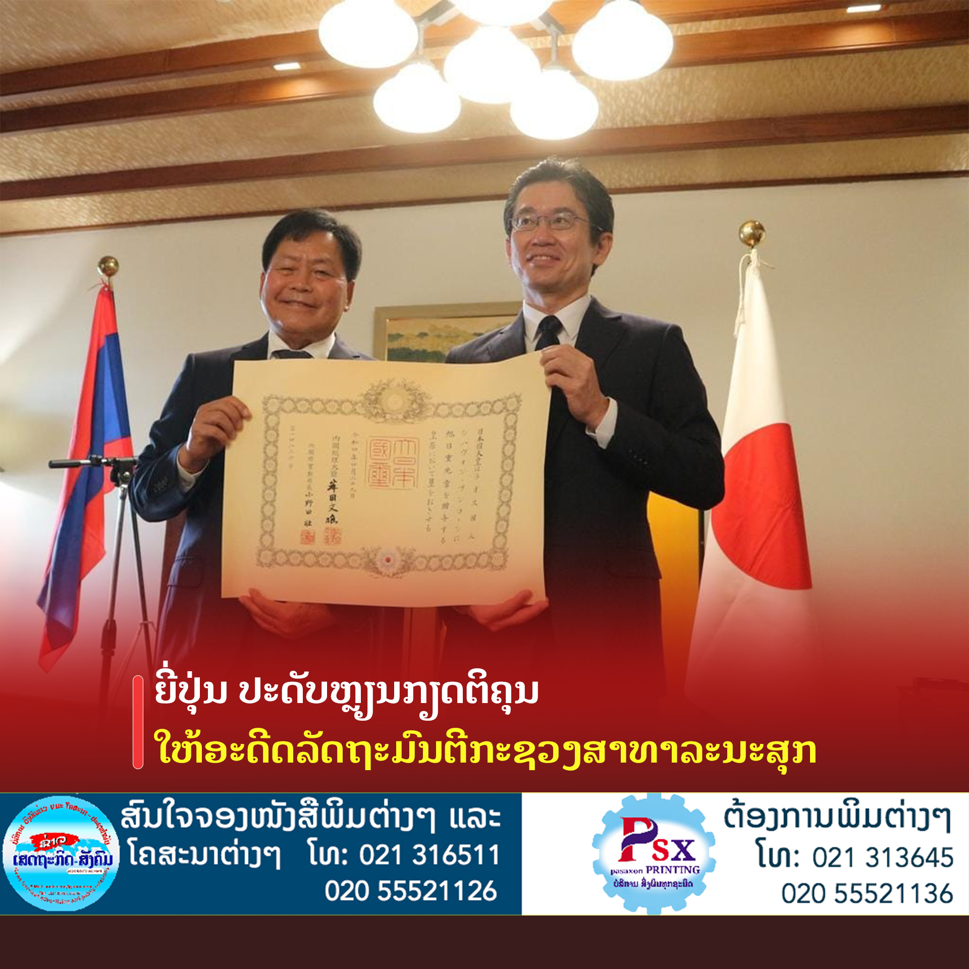 ລັດຖະບານຍີ່ປຸ່ນໄດ້ປະດັບຫຼຽນກຽດຕິຄຸນ ໃຫ້ແກ່ ທ່ານ ບຸນກອງ ສີຫາວົງ ອະດີດລັດຖະມົນຕີກະຊວງສາທາລະນະສຸກ ຊຶ່ງຫຼຽນດັ່ງກ່າວ ເປັນໜຶ່ງໃນຫຼຽນກຽດຕິຄຸນອັນຊົງກຽດທີ່ສຸດຂອງພົນລະເມືອງຍີ່ປຸ່ນ.